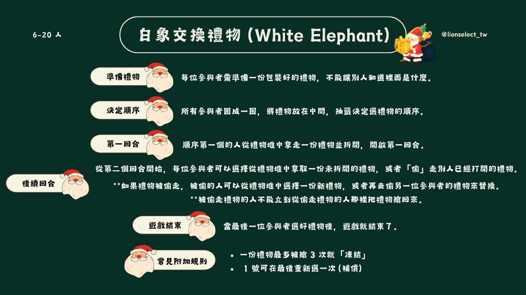 白象交換禮物在歐美聖誕派對超熱門,因為規則簡單又超看「人性」。每個人輪流挑選禮物:可以選未拆的,也可以「偷」走別人已經拆開的禮物。被偷的人還能再去偷別人的,越接近最後面,越緊張刺激,因為你會開始觀察誰手上那份最值得搶!