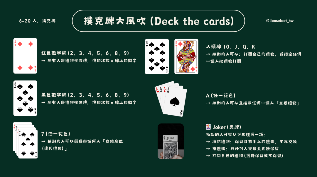 ▶小提醒: 如果人多,建議用兩副牌,否則禮物傳到後面會卡得很嚴重哦。