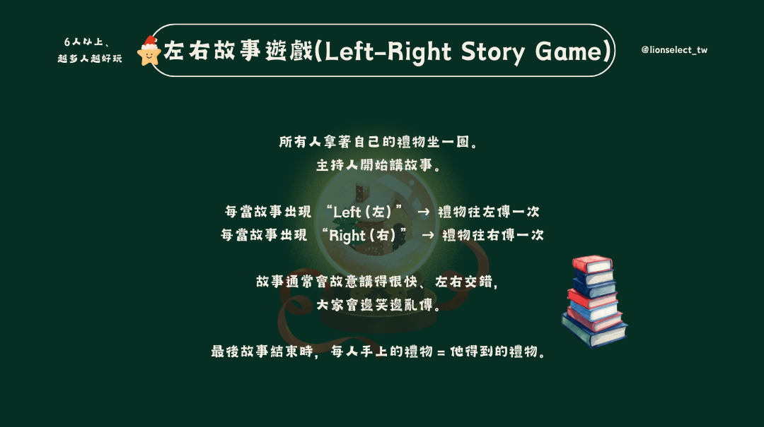 這款遊戲的最大亮點是:故事越混亂,大家越崩潰大笑。 所有人拿著自己的禮物坐成一圈,由主持人讀一段故事。只要故事出現「Left」就往左傳;出現「Right」就往右傳。有些主持人會故意把故事念很快、左右交錯,傳到後面大家的手都會跟不上節奏。最後故事讀完,每個人手上拿到的禮物就是最終獎品。