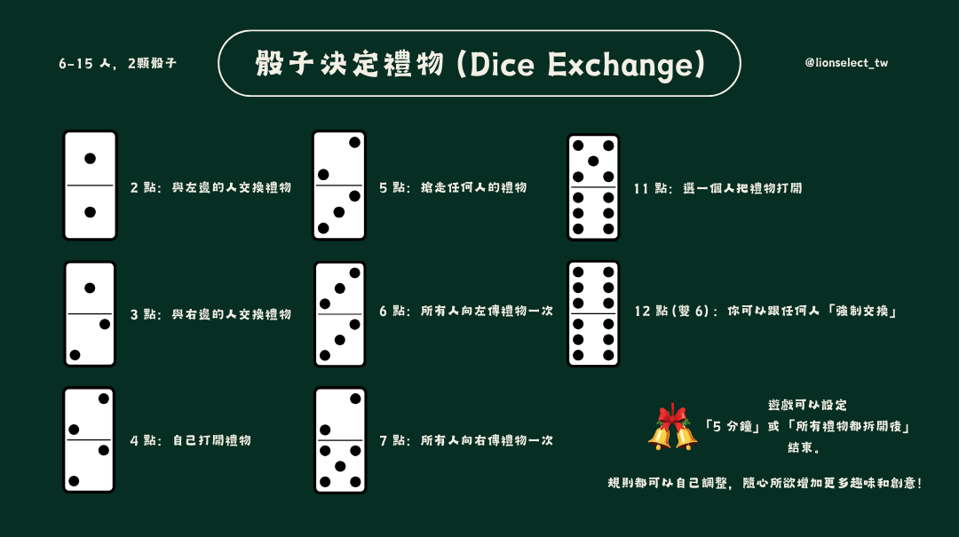 如果你的派對需要一點「混亂的秩序」,骰子交換禮物絕對是最簡單又最容易失控的玩法。所有人圍成一圈,輪流擲骰,不同點數就會觸發不同事件──像是跟左邊交換禮物、直接拆禮物,或是「搶走任何人的禮物」。特別是雙骰組合,如 7、11、12 等數字,通常會引發一波大混亂,禮物在一秒內被搶來搶去,好笑程度完全取決於大家的手氣。