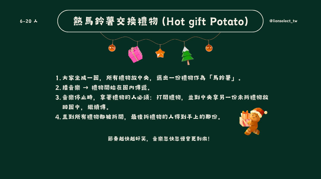熱馬鈴薯是所有遊戲中節奏最快、笑點最多的。大家圍成一圈,把一份禮物當作「馬鈴薯」,配合音樂開始快速傳遞。音樂一停下,停在誰手上,誰就要拆禮物並從中央再選一份新的拿回圈內。這遊戲的神奇點是:音樂忽快忽慢時,大家會尖叫邊傳、急到禮物差點飛出去。節奏越快越好笑,也是增進氣氛最有效的一款。