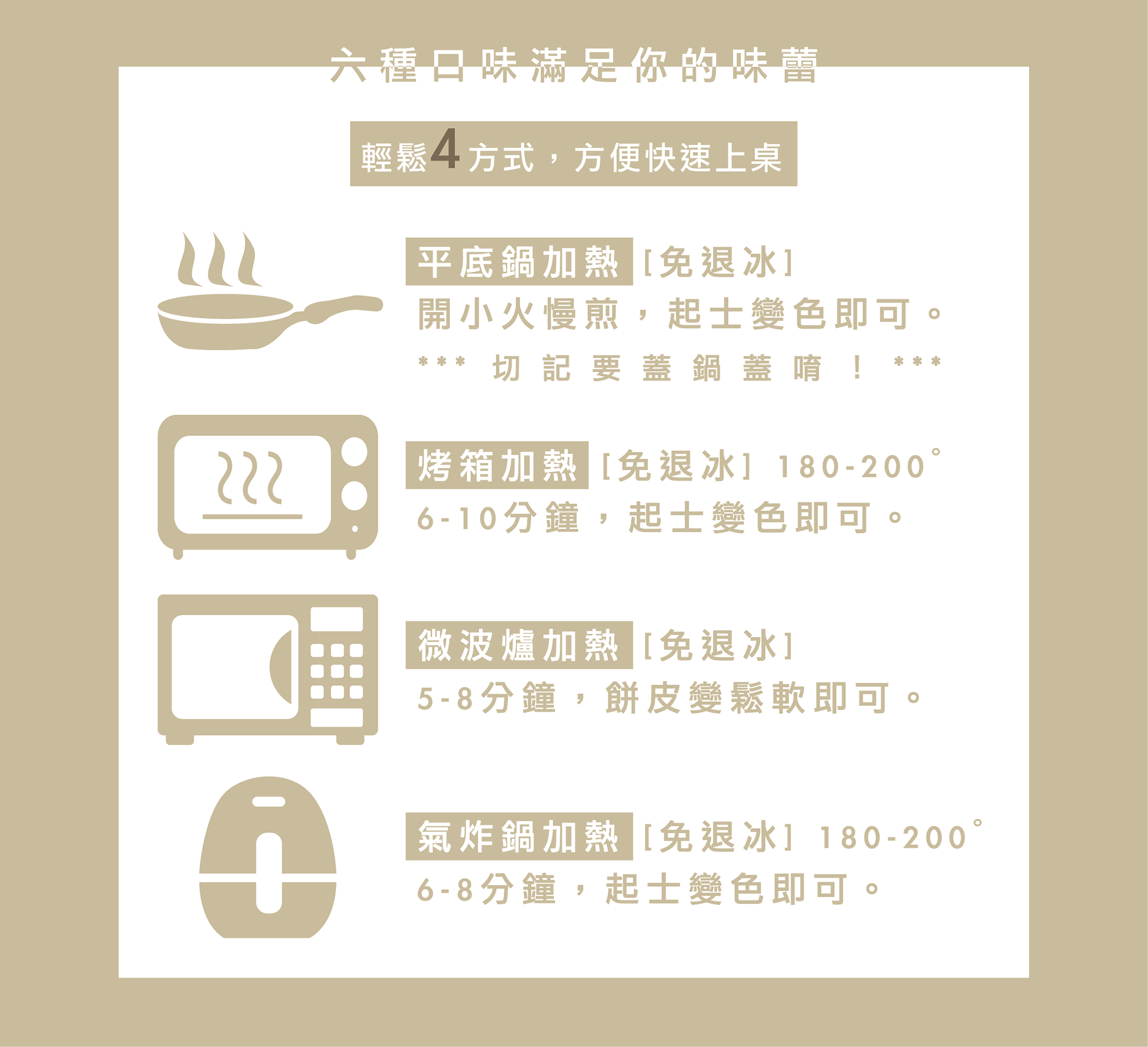 1.平底鍋加熱:免退冰,開小火慢煎,起士變色即可。※切記要蓋鍋蓋喔!