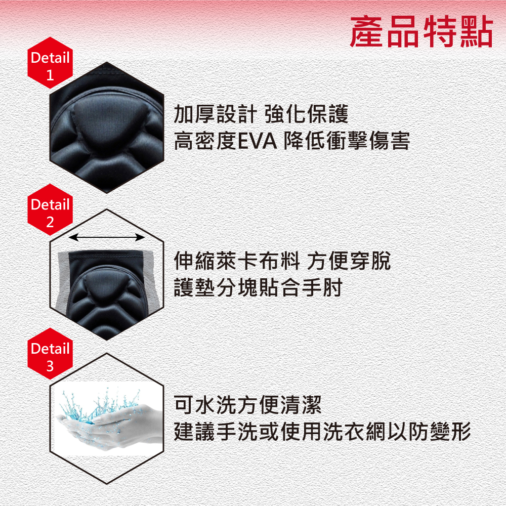 【商品敘述】軟護肘,加厚設計,強化保護。伸縮萊卡布料,方便穿脫。
