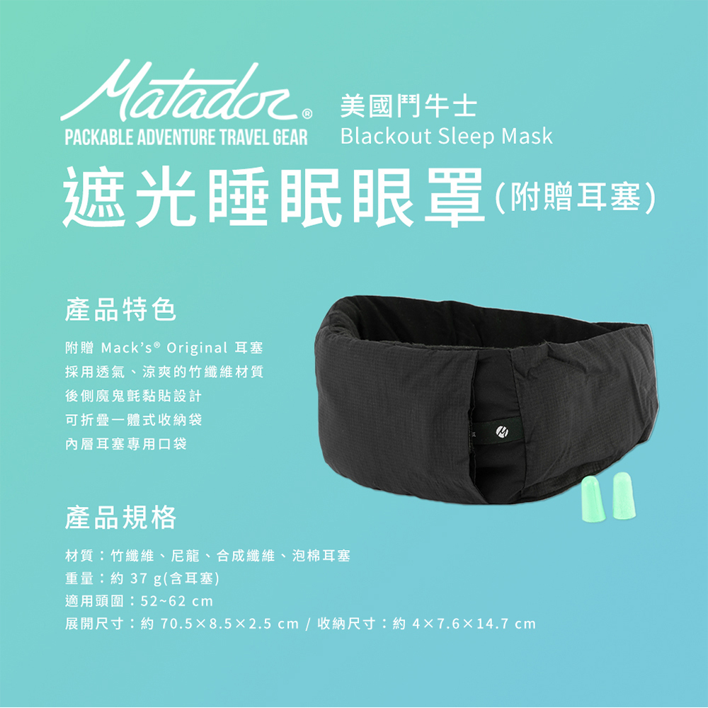 Matador Blackout Sleep Mask 遮光睡眠眼罩,專為深度睡眠設計,全方位遮光,幫助您在飛機、旅途中或日常午休時輕鬆入眠。立體剪裁減少眼部壓迫,透氣柔軟材質提供極致舒適感,長時間佩戴無負擔。附贈高效隔音耳塞,打造理想的安靜睡眠環境,是旅行者、夜班族與淺眠者的最佳選擇。