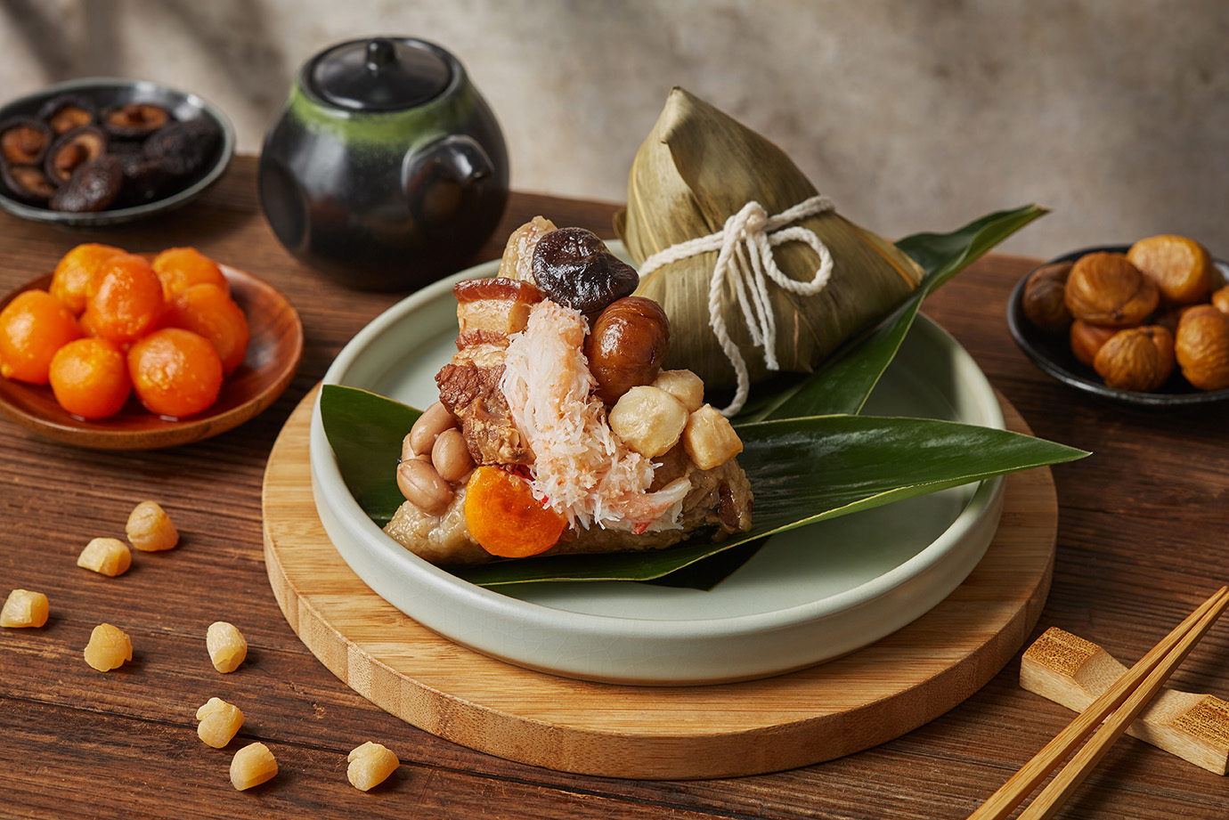 長糯米、松葉蟹肉、蛋黃、香菇、栗子、花生、干貝、豬高湯(豬骨、水)、豬油(產地來源:台灣)、開陽、豬肉(產地來源:台灣)、油蔥酥(紅蔥頭、大豆沙拉油)、黑胡椒粒、糖、L-麩酸鈉、醬油、米酒。