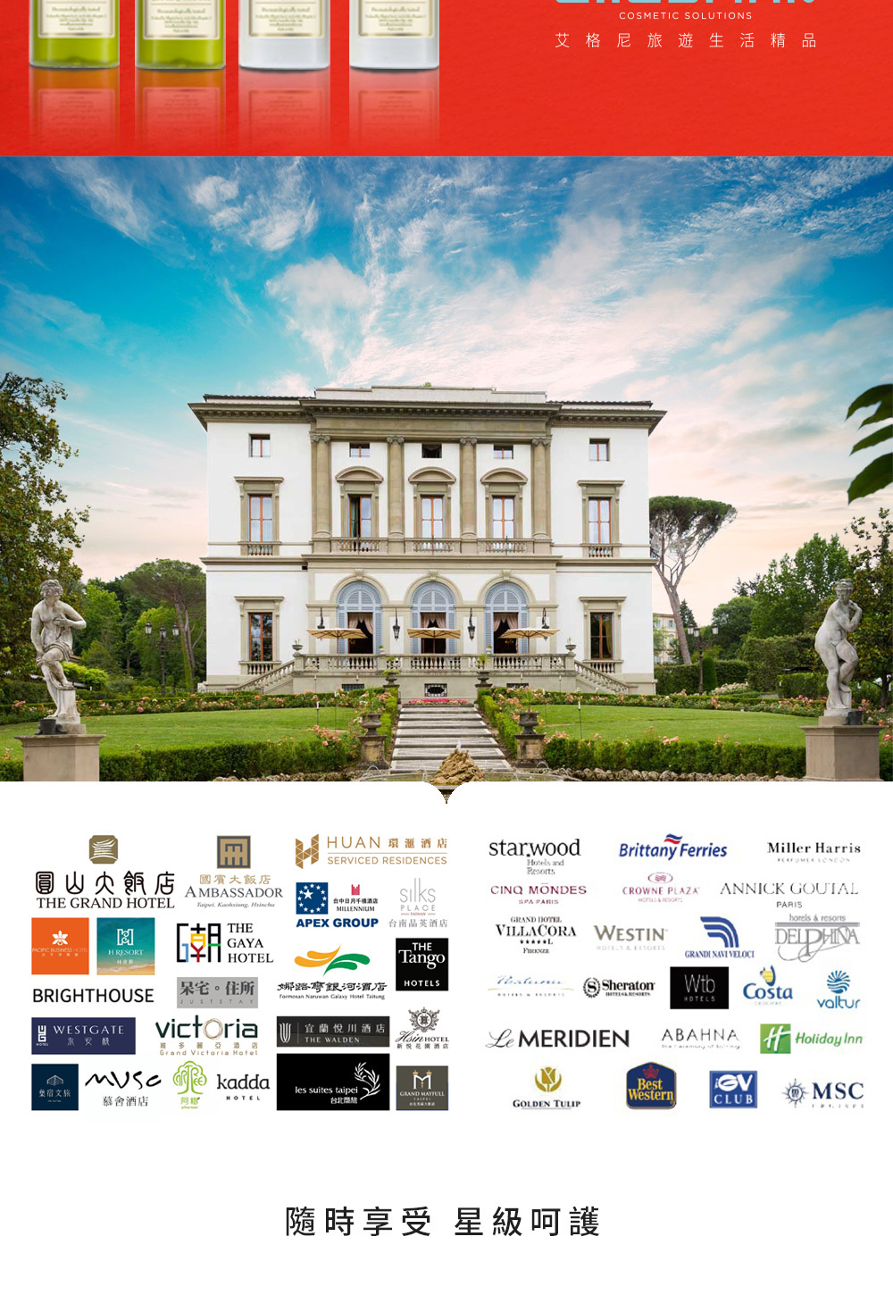 艾格尼於1945年創立於義大利,以清潔用品起家,70多年來秉持優良傳統、永續環保的理念,歷經時間考驗,屹立不搖,近三十年加入的沐浴香氛系列獲全球知名飯店集團及時尚圈認可及喜愛,是世界各地的星級飯店內常見沐浴精品,更是影展指定給明星名人的紀念禮品。