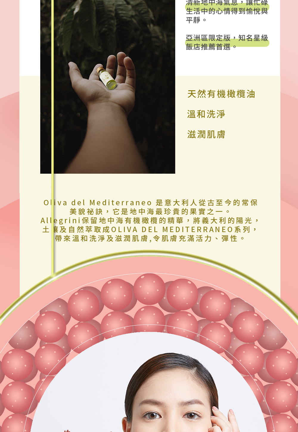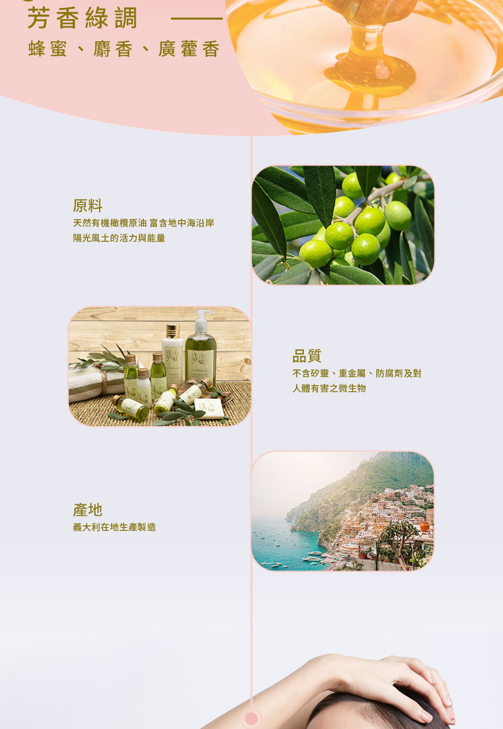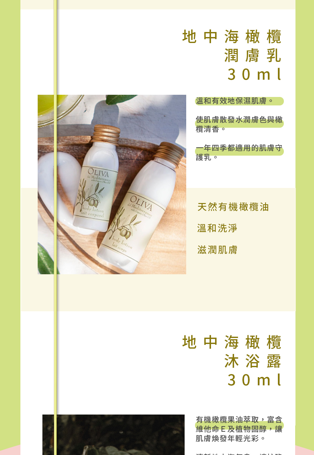 頭髮、膚質及清潔養護一次到位,沉靜在地中海橄欖系列,富含維他命E的溫和配方,洗去今日旅程的疲勞,迎向明日嶄新愉悅的視野。