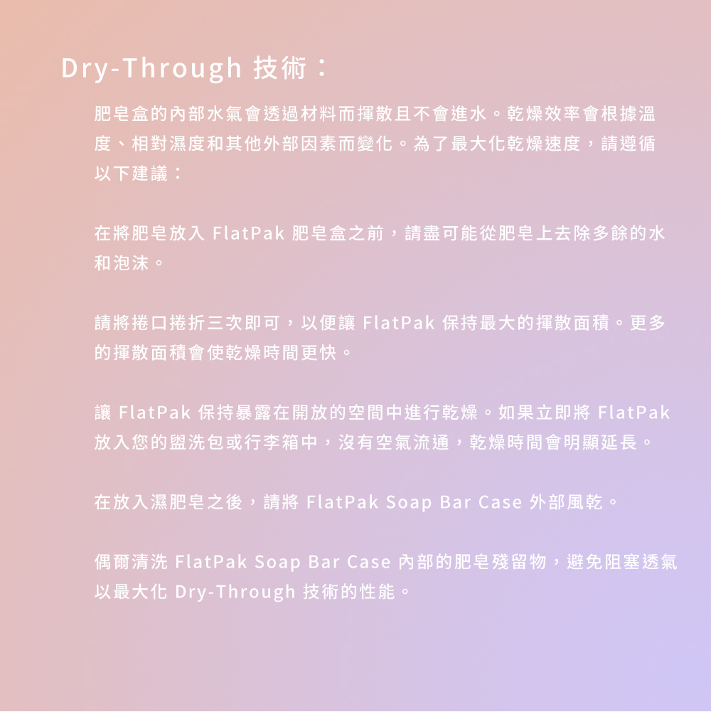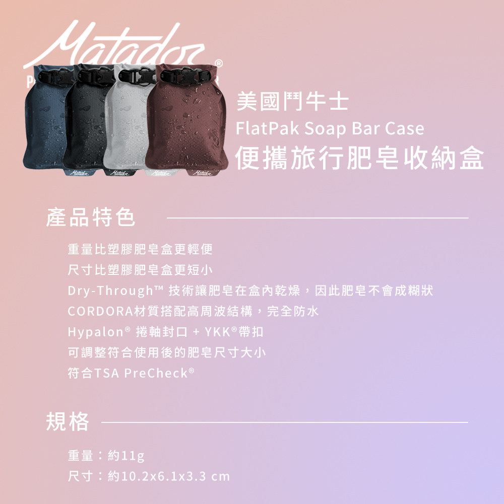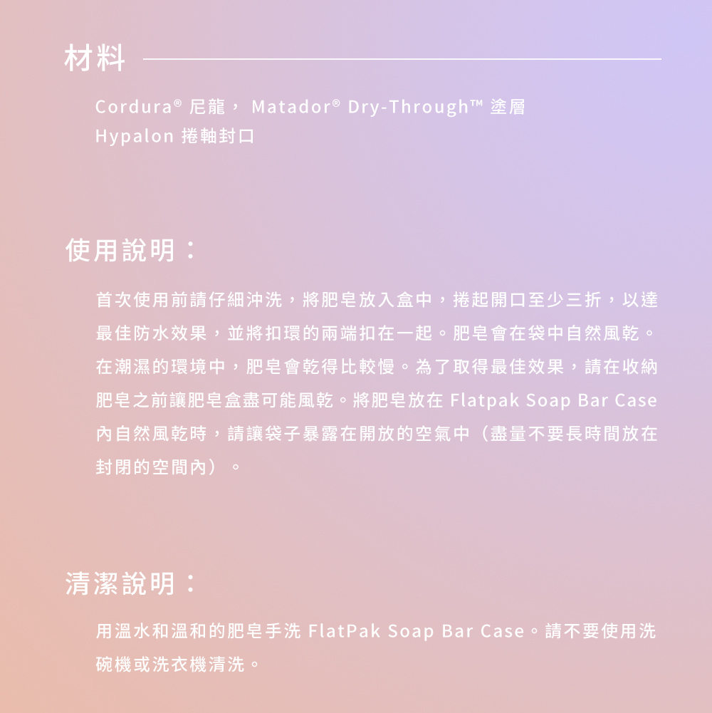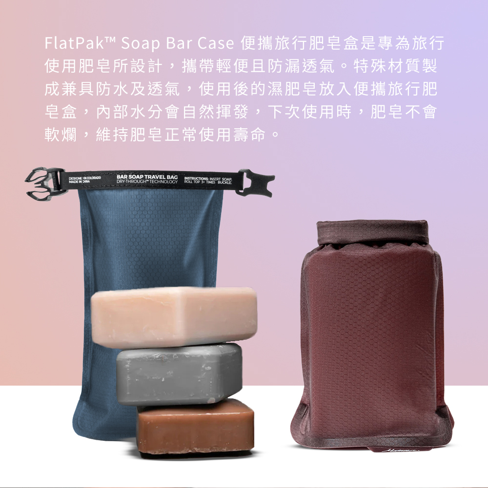 Matador FlatPak Soap Bar Case 便攜旅行肥皂收納盒,專為旅行者設計,輕巧耐用且防水透氣,能有效延長香皂使用壽命。獨特的快乾材質可防止肥皂溶解,保持乾爽衛生,適合露營、登山、出差或長途旅行。便於攜帶的設計讓您隨時保持清潔,避免一次性塑膠瓶的浪費,是環保又實用的旅行盥洗配件。