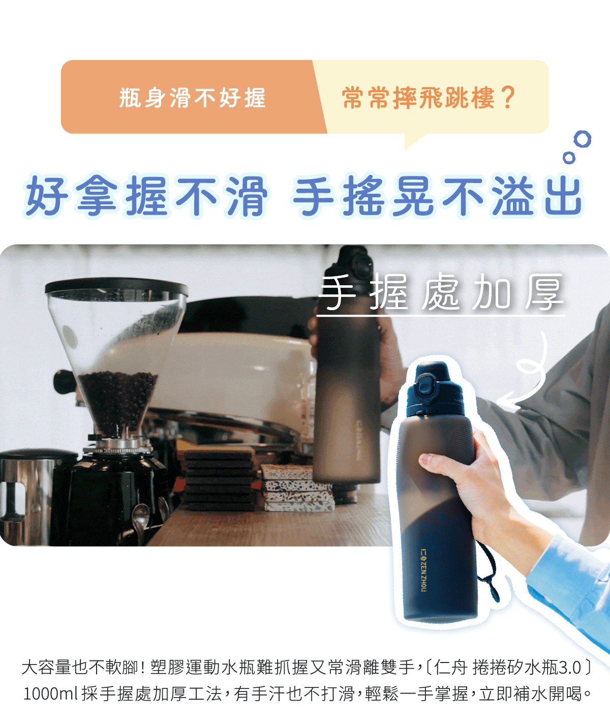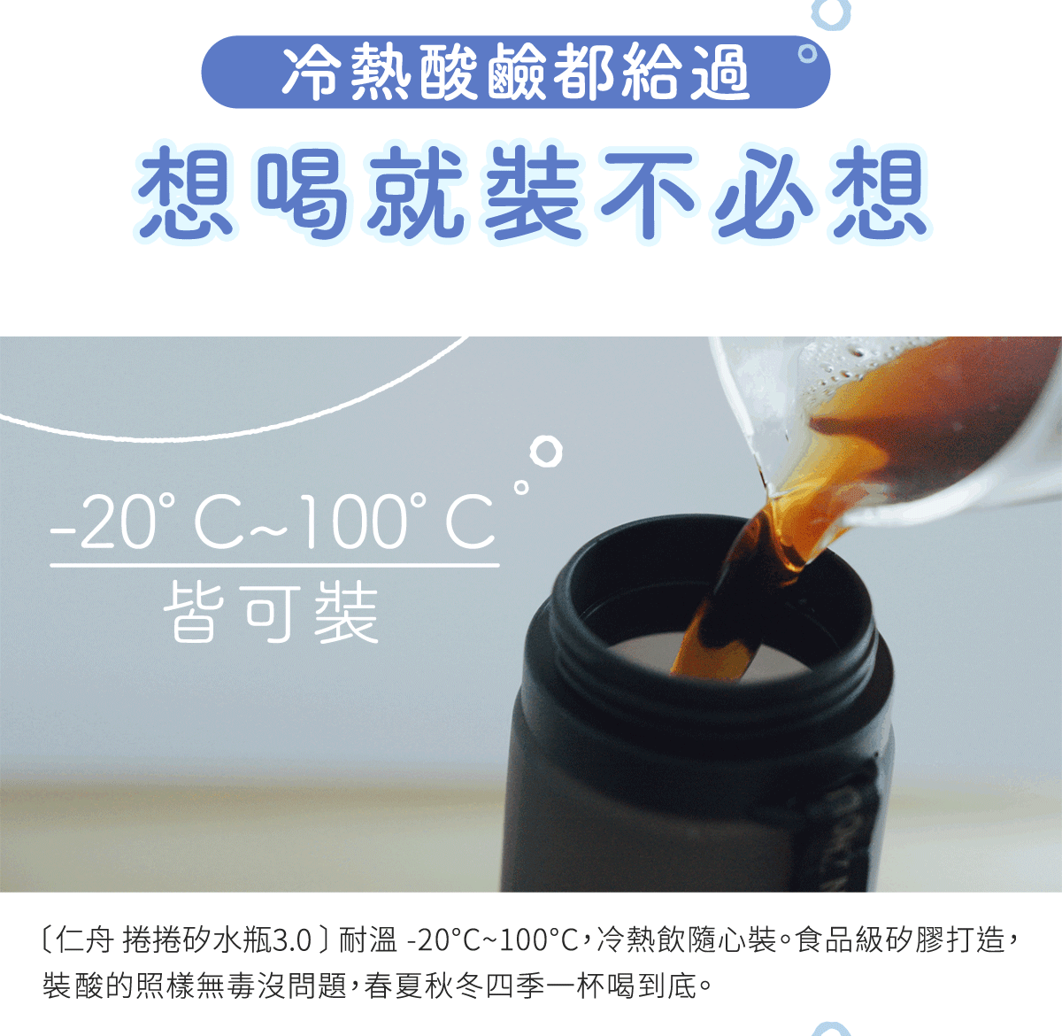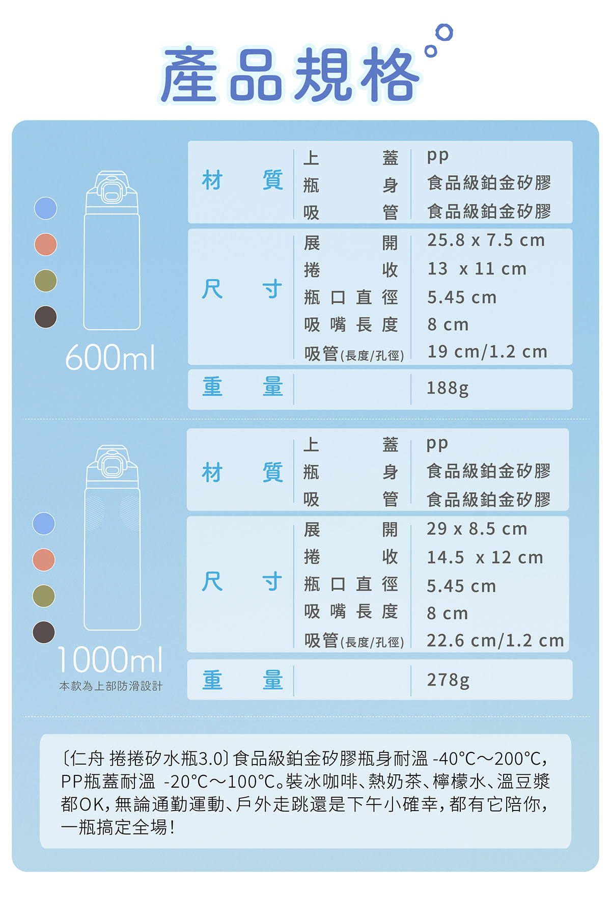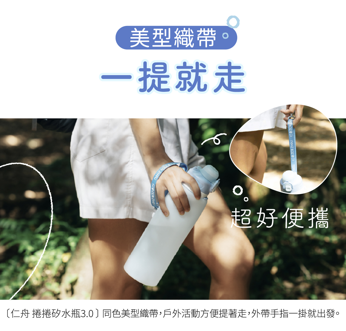 【商品成分】瓶身/吸管(食品級矽膠)+瓶蓋/瓶頸(PP)+提繩織帶(聚酯纖維+矽膠扣環)