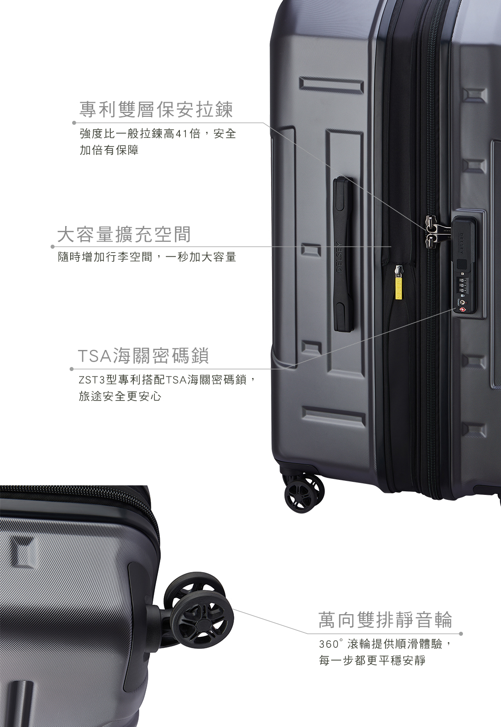 歐洲知名品牌DELSEY是全世界最安全的旅行箱,集合15大頂尖設計師團隊,打造出世界專利ST保安拉鍊,融合流行設計與堅固耐用的性能,讓全球旅行者帶來更多的安全與保障。