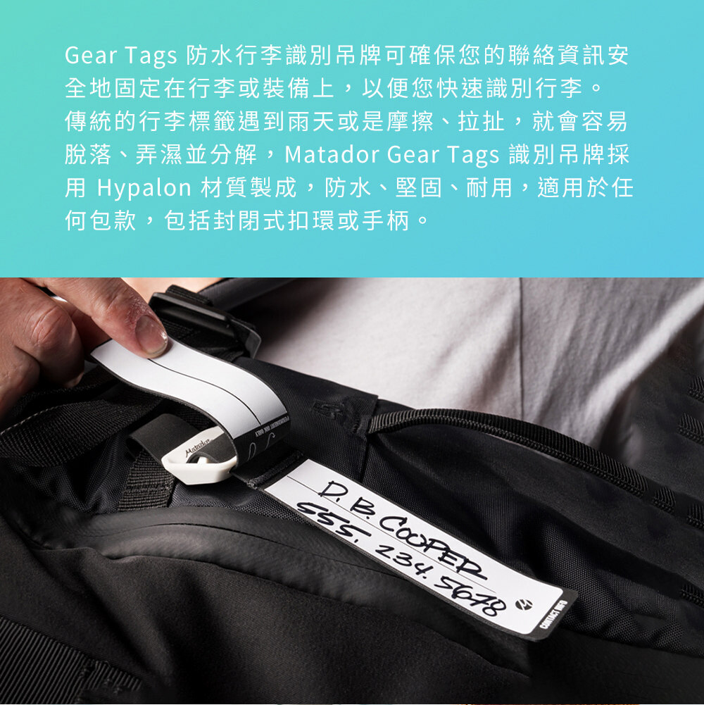 Matador Gear Tags 防水行李識別吊牌,專為旅行設計,幫助您快速識別行李,避免錯拿或丟失。每組包含兩個耐用吊牌,採用防水材質,適應各種戶外及旅行需求。無論是飛機旅行、露營或商務出差,這款行李識別吊牌都能提升您的旅行效率,並加強行李保護。加上簡潔現代的設計,完美搭配各式行李箱與背包。