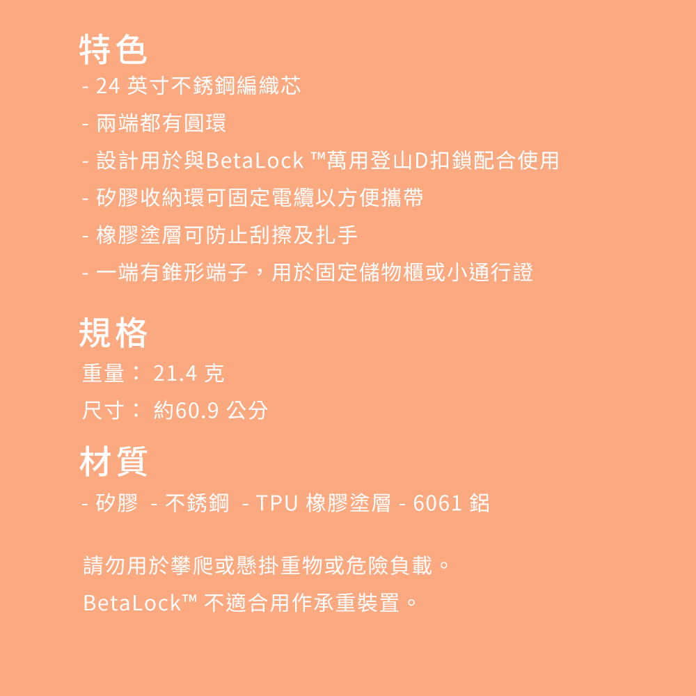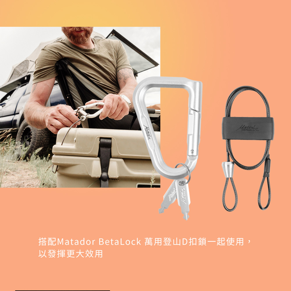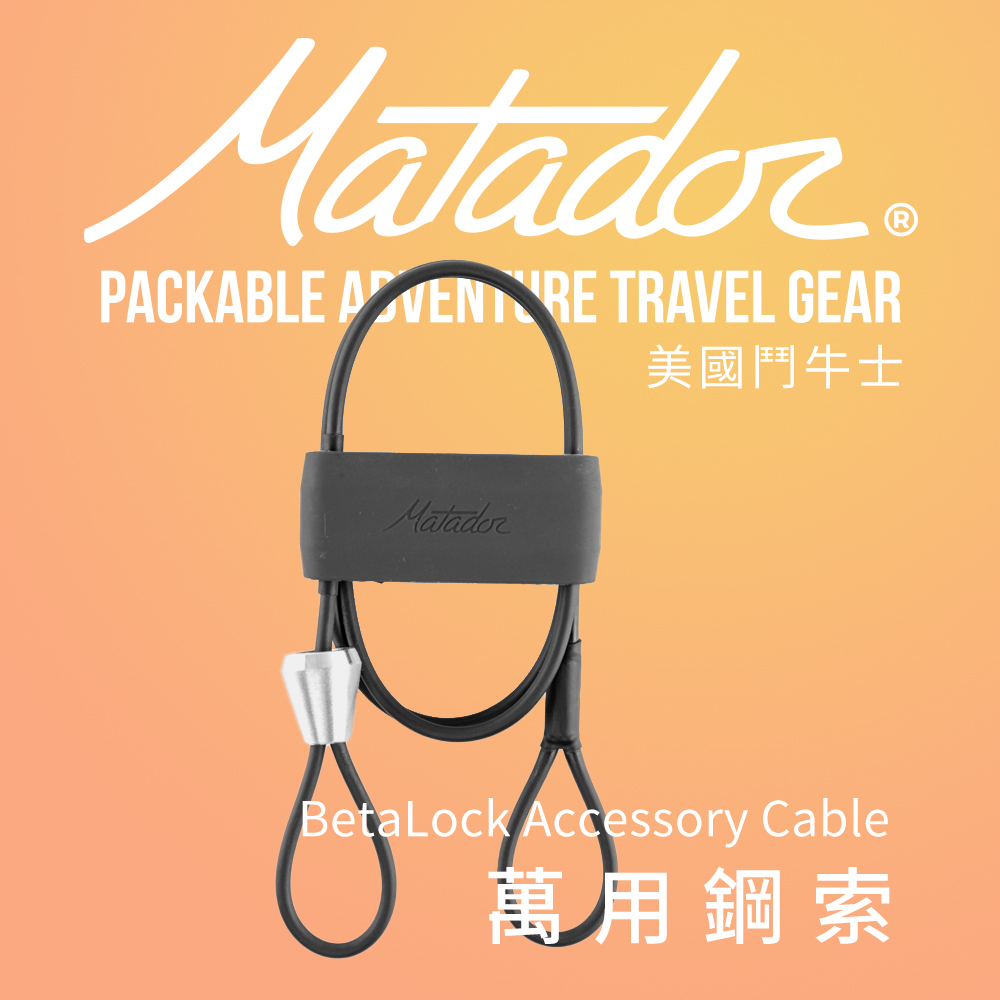 Matador BetaLock Accessory Cable 萬用鋼索,採用耐用不鏽鋼纜線,搭配防盜鎖定機制,有效保護背包、行李、自行車等物品安全。輕巧便攜,適合旅行、露營、登山等戶外活動,讓您的裝備防盜無憂。靈活設計,可固定各種物品,是城市通勤與戶外探險的最佳防護裝備。
