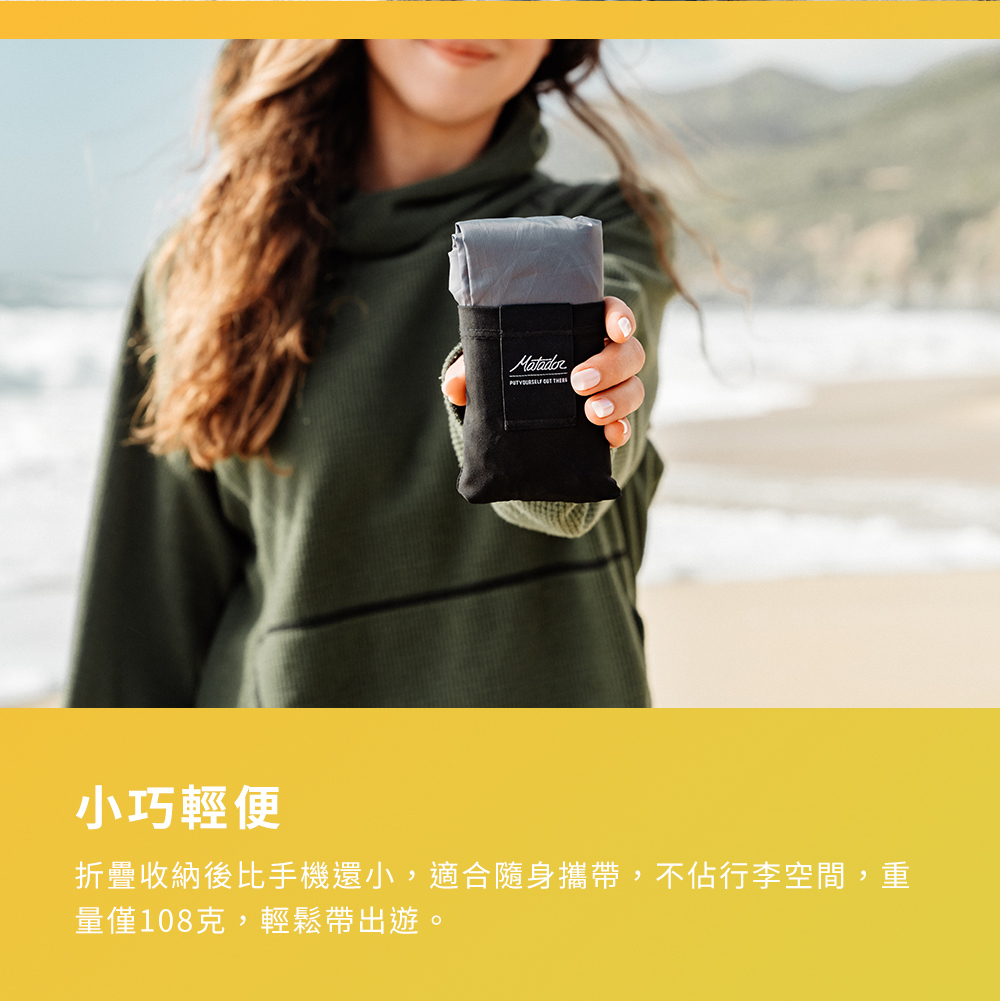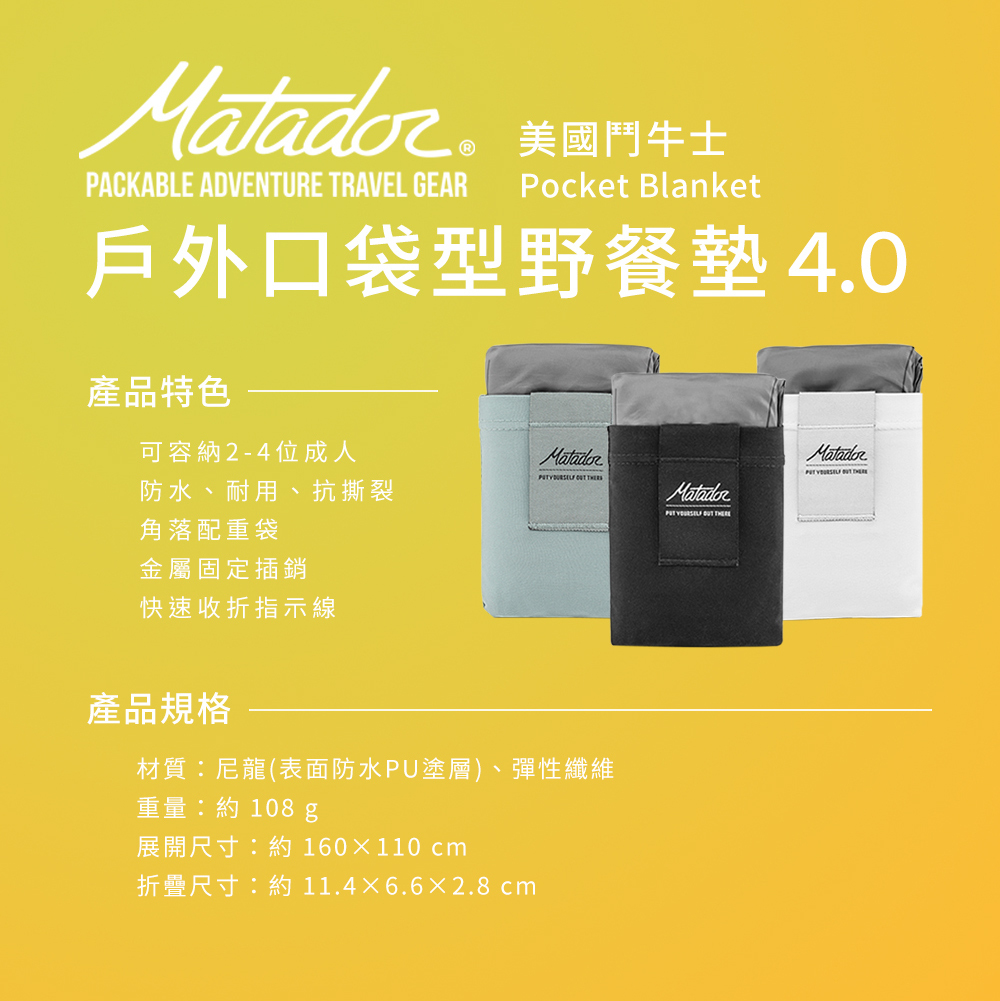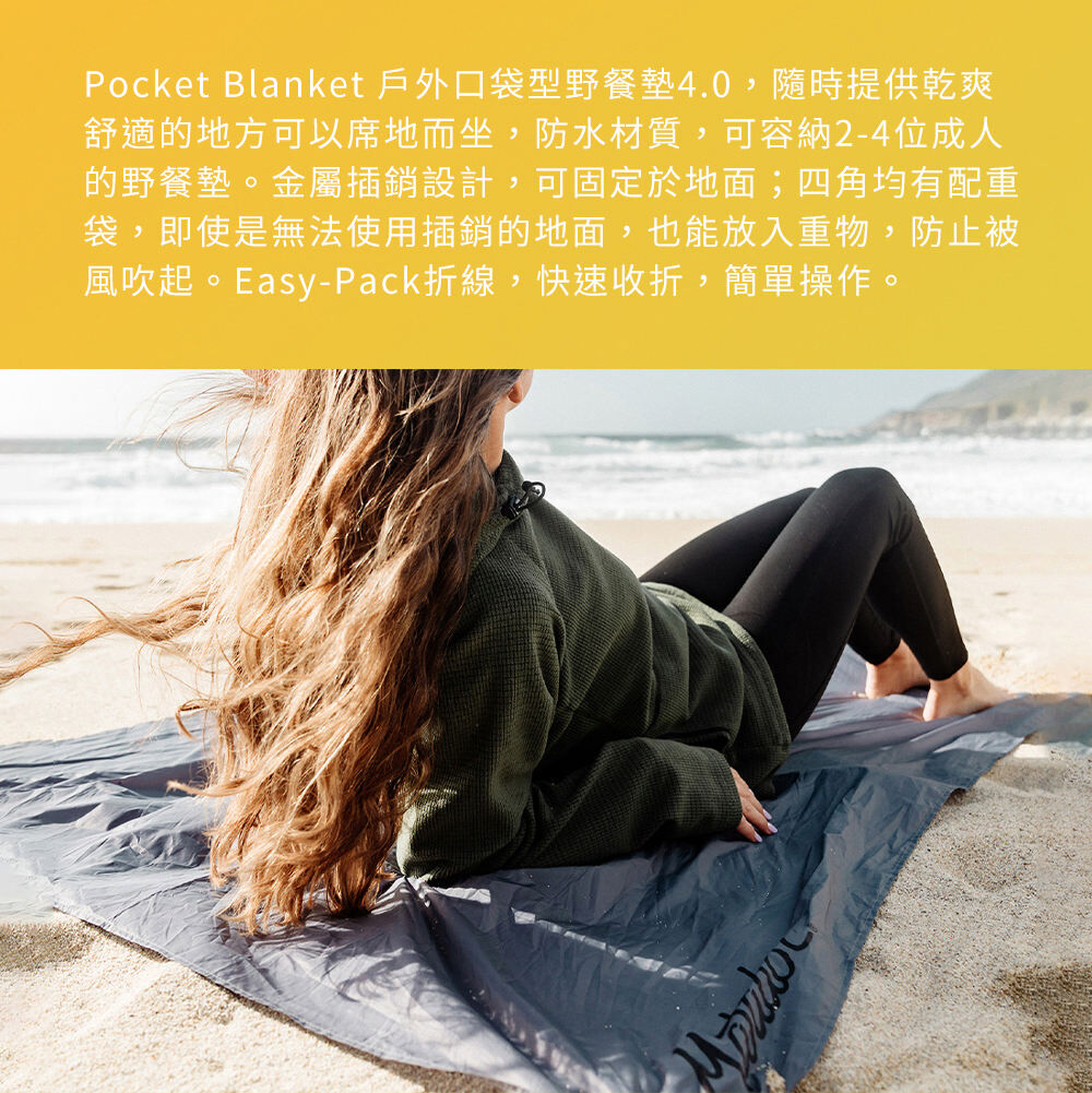 Matador Pocket Blanket 4.0 戶外口袋型野餐墊,專為露營、登山、野餐、旅行打造,輕薄可折疊至掌心大小,隨身攜帶無負擔。防水耐磨材質,有效阻隔潮濕與汙漬,確保舒適體驗。搭配四角固定設計,即使風大也能穩固使用。無論是公園野餐、戶外探險、海邊度假,這款迷你防水野餐墊都是你的最佳選擇!