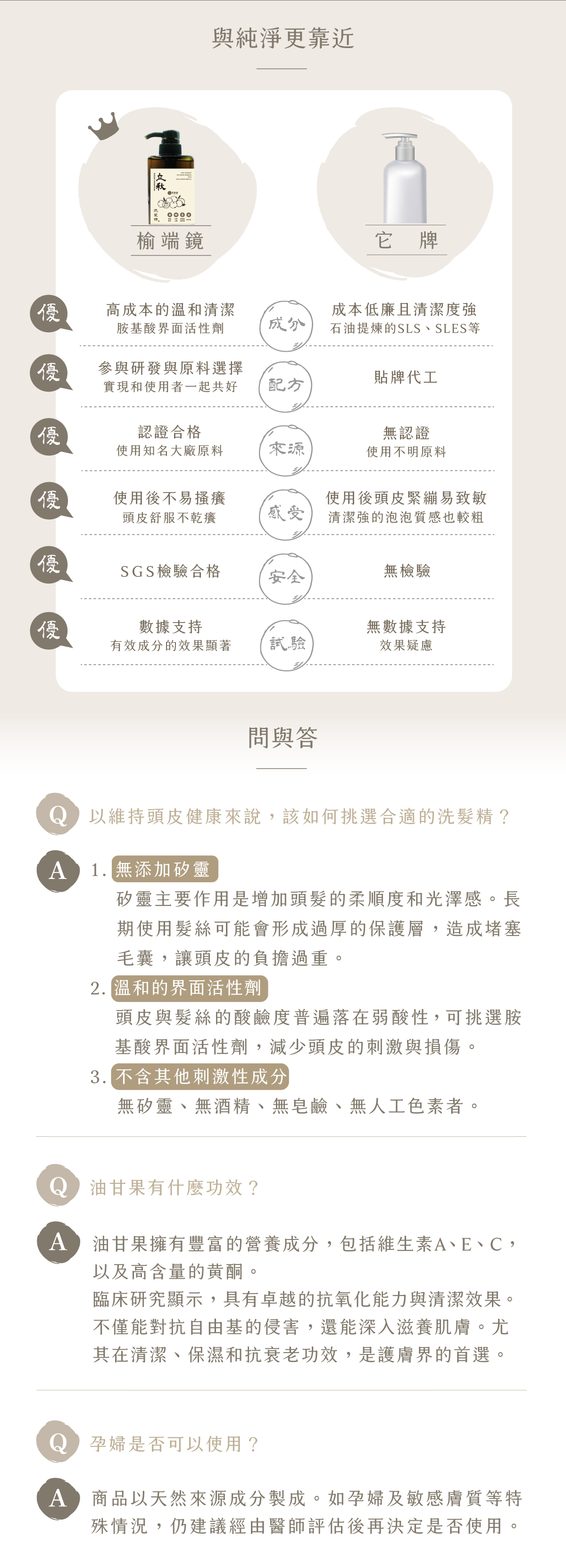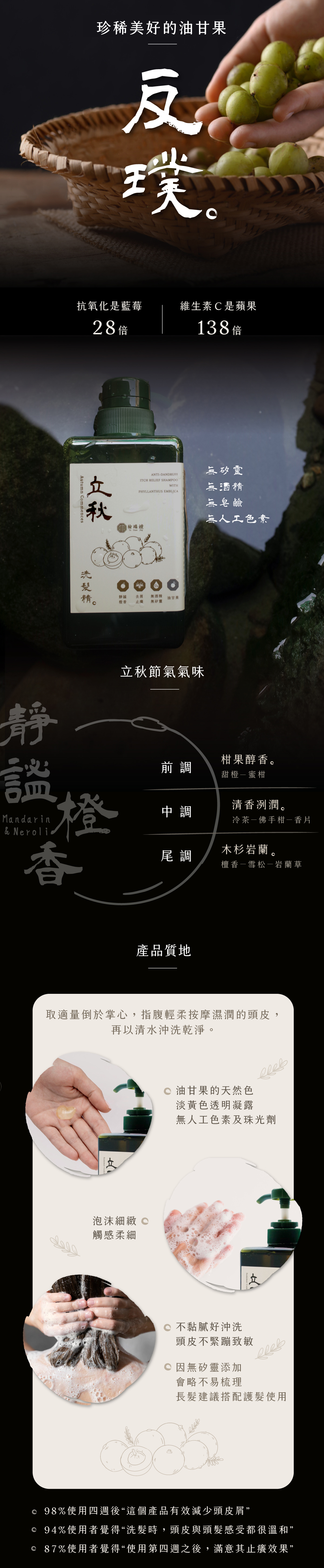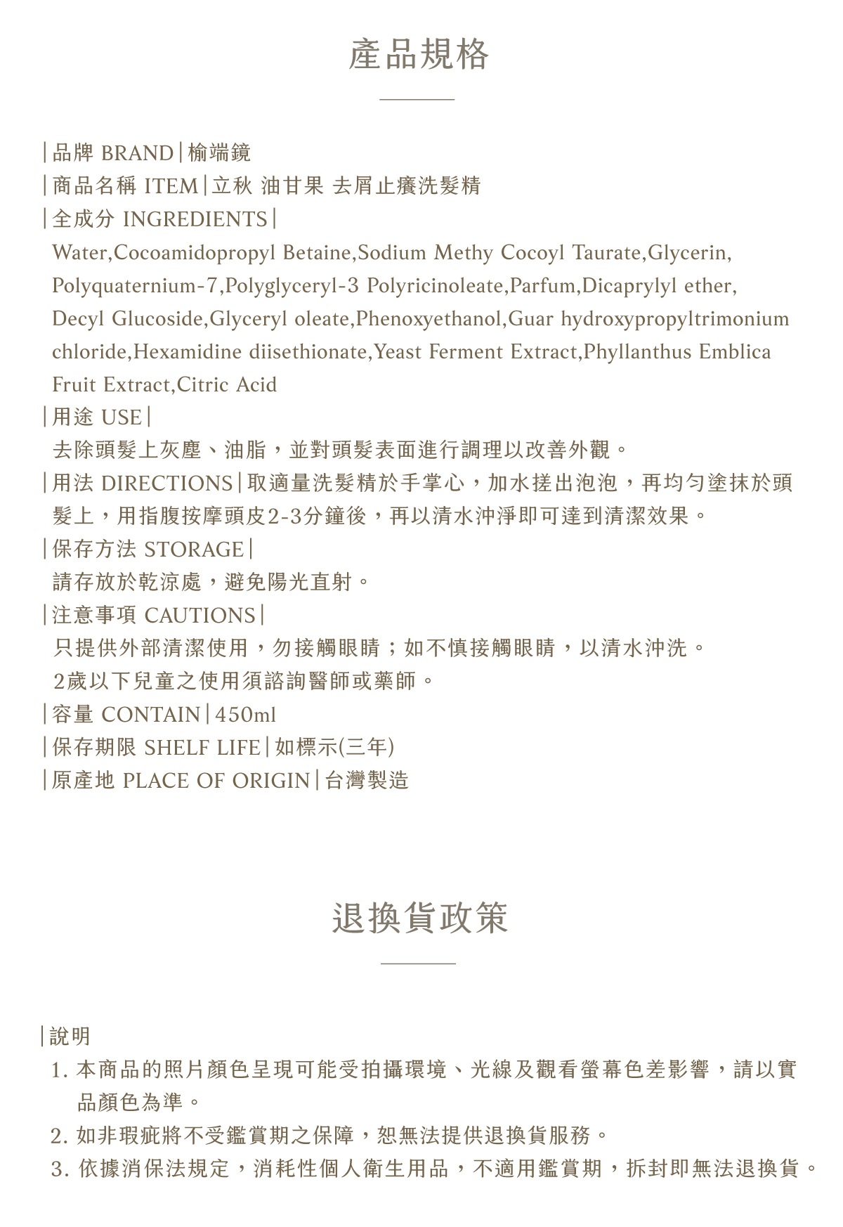 榆端鏡立秋油甘果去屑止癢洗髮精,適合中性 / 乾性 / 混合型 / 頭皮屑型,有效舒緩頭皮不適並減少頭皮屑,穩定頭皮狀態。適合日常使用,結合天然油甘果成分,帶來健康潔淨感,是追求去屑洗髮精和止癢洗髮精的理想選擇。