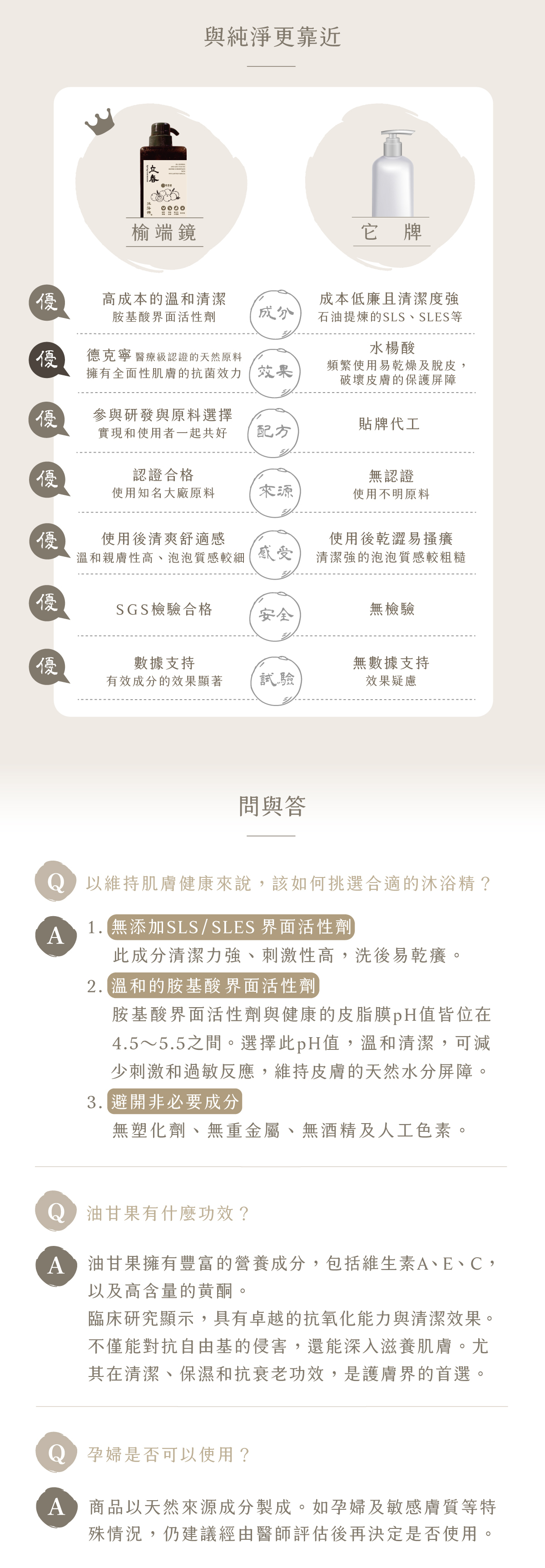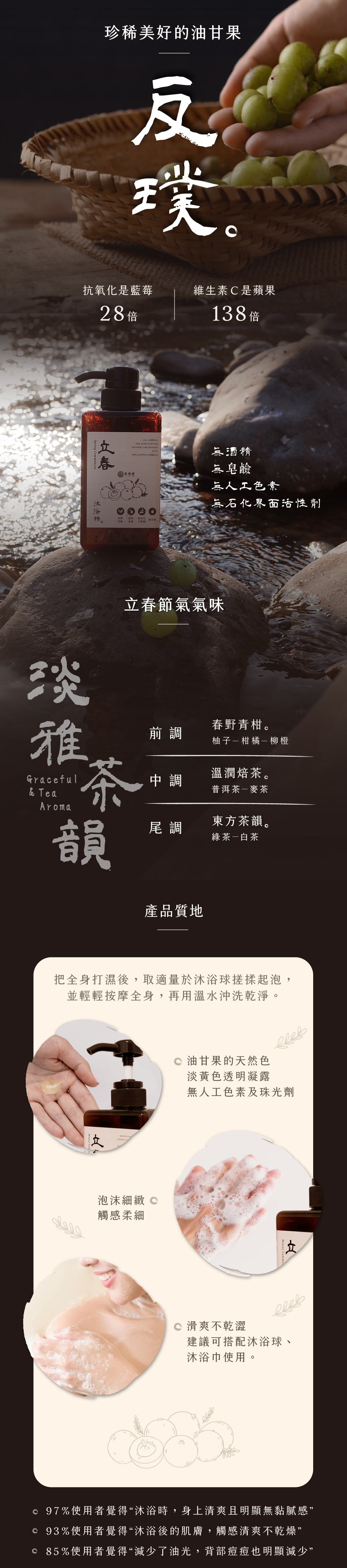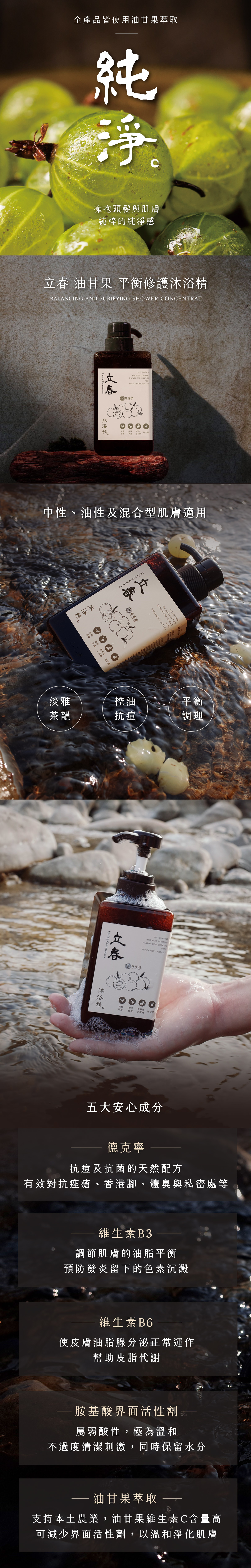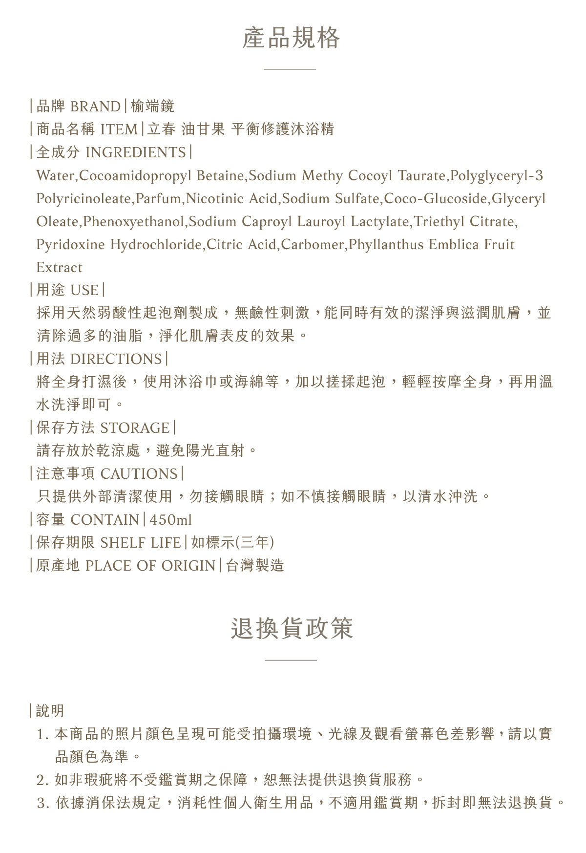 榆端鏡立春油甘果沐浴精,萃取自然油甘果與胺基酸親膚配方,溫和清潔同時平衡油脂,改善中性至混合肌膚的乾燥與緊繃感。淡雅綠茶白茶香氣,洗後肌膚柔嫩舒適,是尋找「油甘果沐浴精」、「平衡修護沐浴」、「天然潔淨」的最佳選擇。