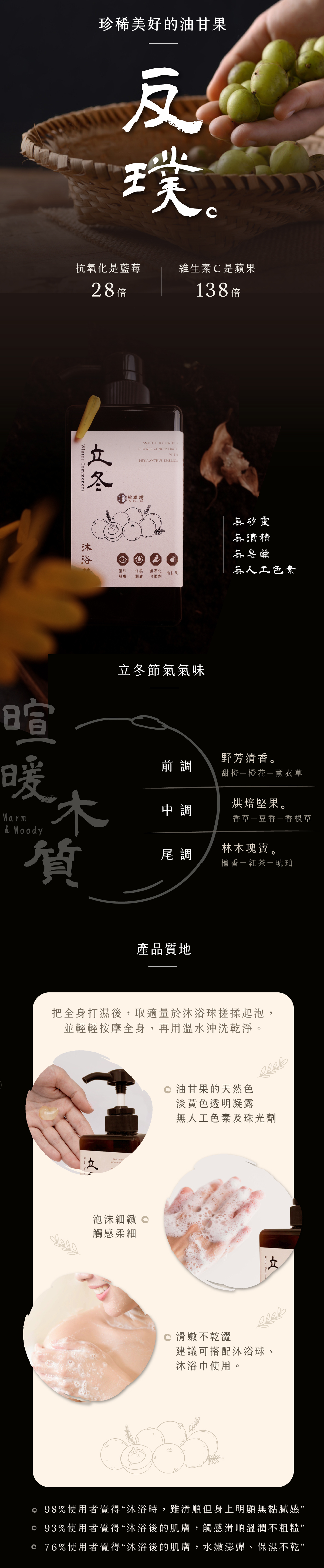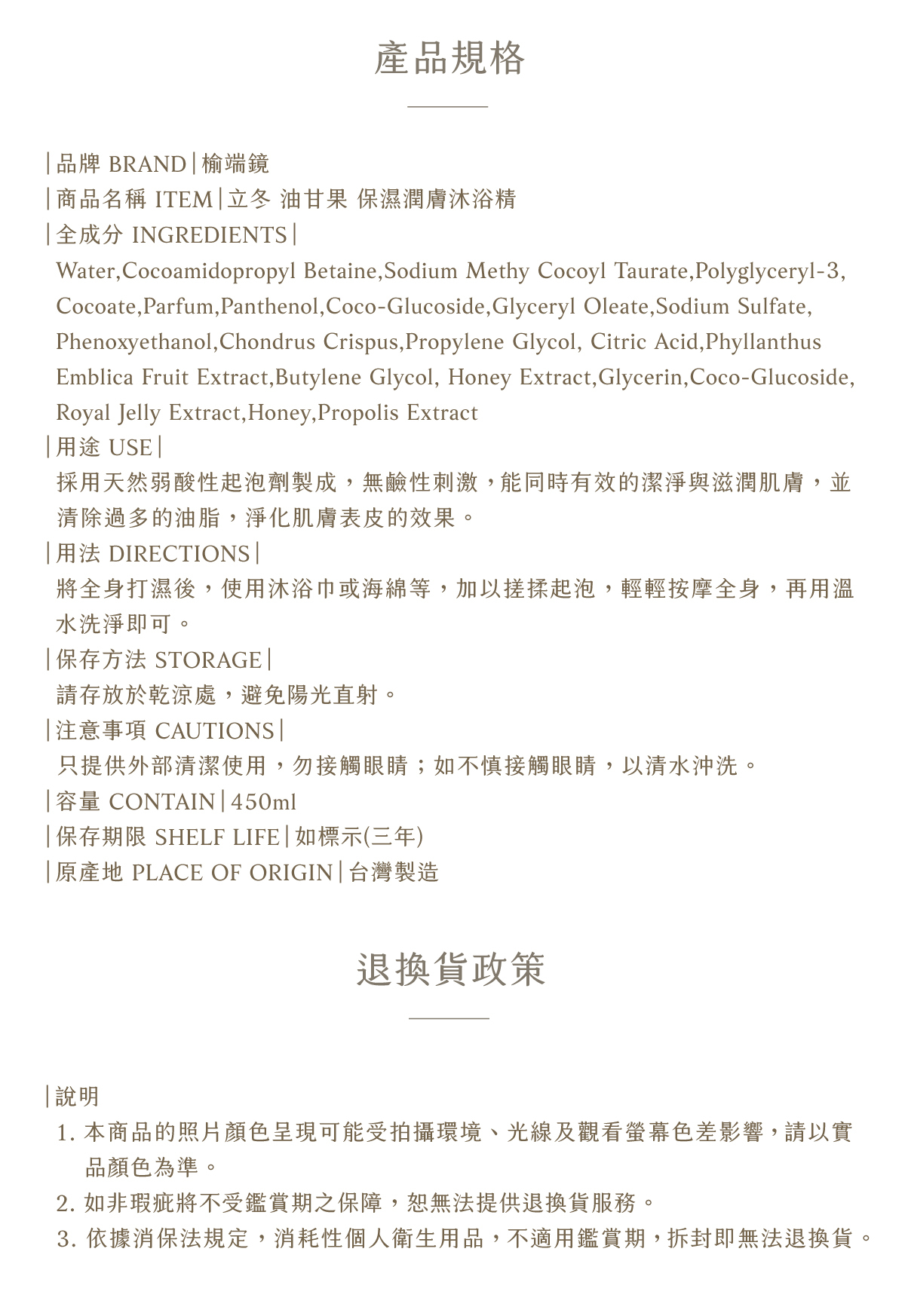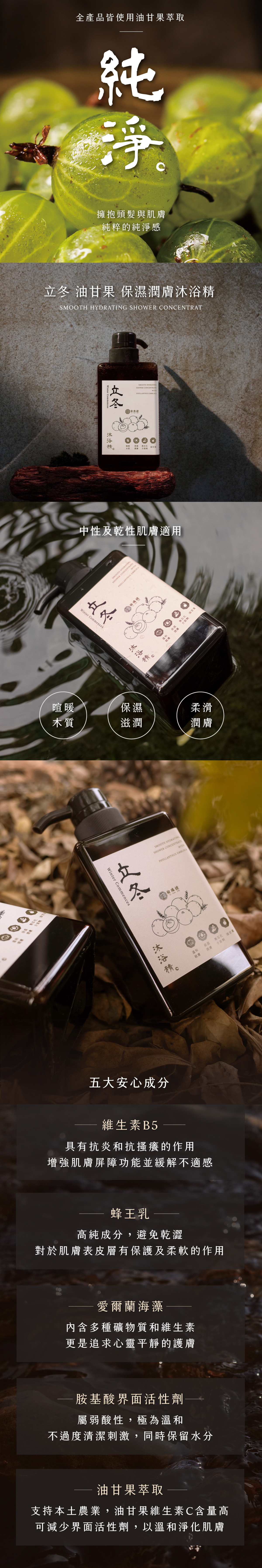 榆端鏡-立冬油甘果保濕潤膚沐浴精,採用天然油甘果萃取,專為乾燥肌膚設計。溫和潔淨同時深層保濕,適合全家日常使用。家庭瓶與環保補充包雙選,滿足不同需求,讓您輕鬆擁有柔嫩滑膚體驗。