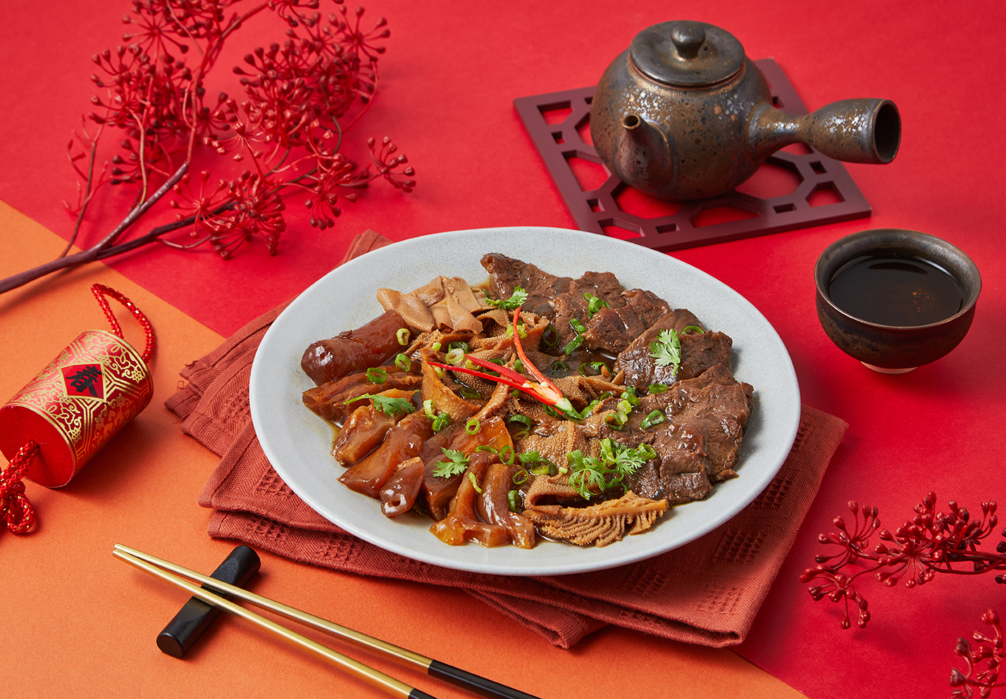 運用胡同獨門秘製「胡同燒肉醬」醬汁,將牛筋、牛肚、牛腱慢燉到Q彈不爛,滷汁香氣完美交融,今年最強年菜開胃菜,不管冷盤、熱盤皆可輕鬆上桌。