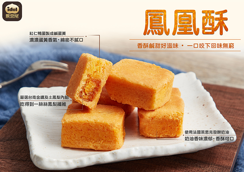愛豆屋鳳凰酥嚴選法國發酵奶油製作香酥外皮,內餡以台南關廟土鳳梨與金鑽鳳梨慢火熬煮,融合鹹蛋黃的濃郁鹹香,酸甜交織層次豐富。手工烘焙的鳳梨蛋黃酥,是中秋節伴手禮與節慶送禮的首選人氣甜點。