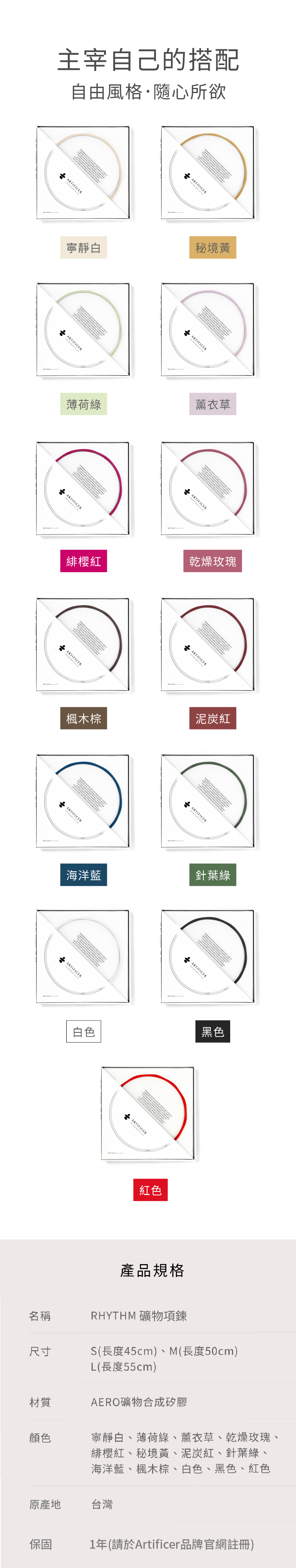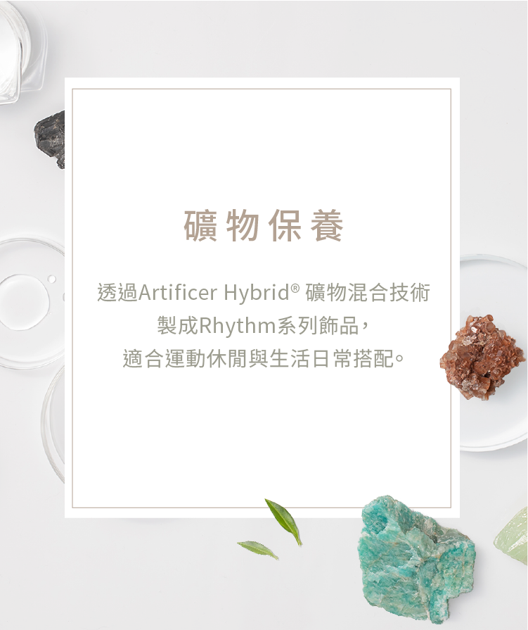 Rhythm 礦物項鍊採用 Artificer Hybrid® 礦物混合技術,融合多種礦物元素,並具遠紅外線特性,適合日常佩戴與運動穿搭。輕盈矽膠材質,柔軟貼合肌膚,無須擔心水洗或流汗,沐浴、游泳皆可配戴。產品通過 SGS 測試,符合 歐盟玩具安全標準 (EN71),並榮獲 金點設計獎,展現獨特工藝與時尚感。不論日常穿搭或運動風格,都能輕鬆駕馭,兼具機能性與個人特色。