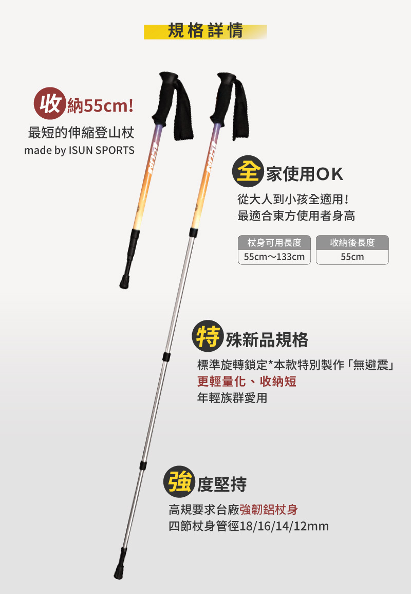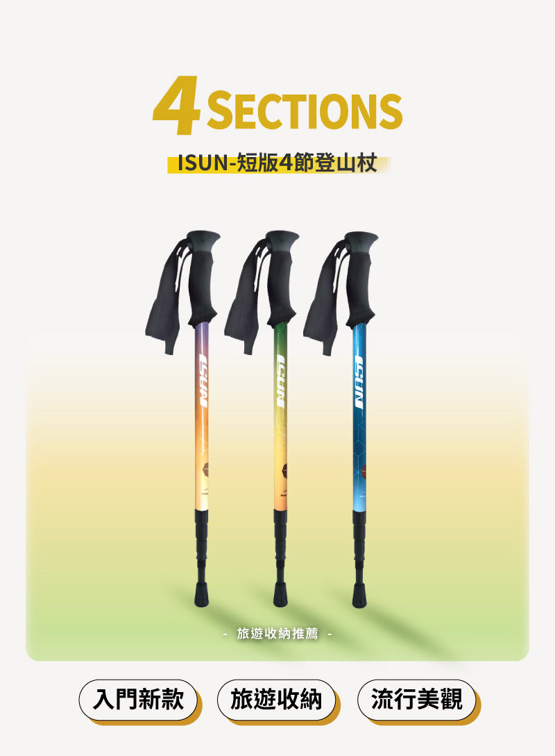 宜山NaturalColor短版登山杖,專為健行、登山設計,輕巧四節收納、攜帶便利。高密度EVA握把吸汗防滑,無避震設計穩定支撐。登山杖推薦、折疊登山杖、戶外用品首選。