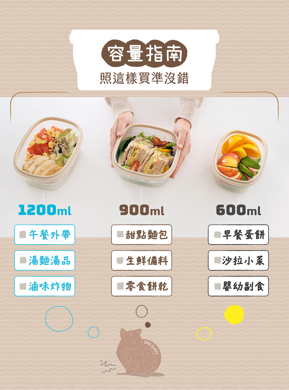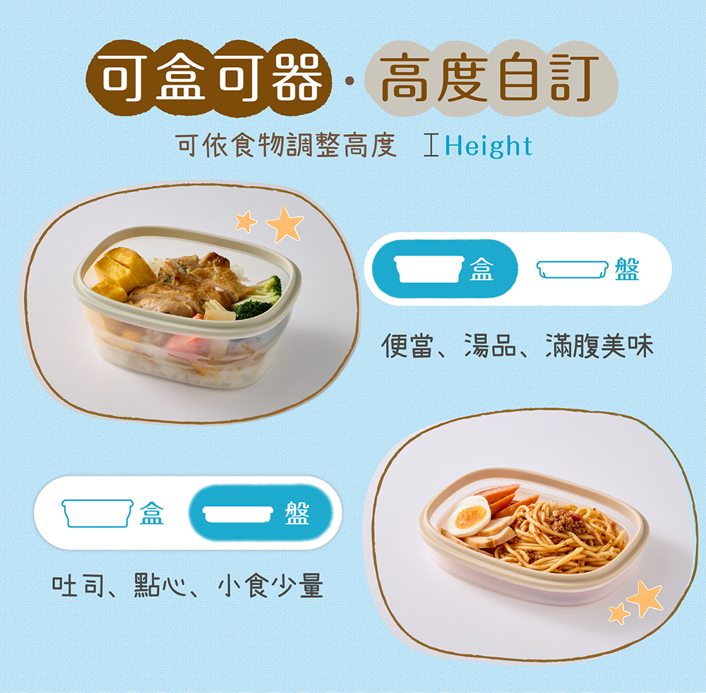 能收能伸二段變形金剛,結實耐摔的萬用寶鮮盒。盒蓋氣塞化身為會呼吸的軟Q動物們,吸氣按下簡易真空效果保鮮更持久,呼氣拉起連蓋直接加熱安全又方便。一呼一吸間,守護您的健康與美味。