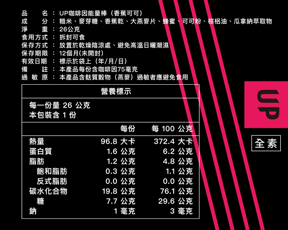 UP Sports 咖啡因能量棒(香蕉可可口味)結合碳水化合物與75mg瓜拿納咖啡因,提供運動前快速補給。嚴選糙米、大燕麥片、台灣香蕉乾與法國可可粉製成,低於100卡熱量,適合跑步、自行車、健身等運動。26g輕巧包裝,方便攜帶,助您隨時補充能量。
