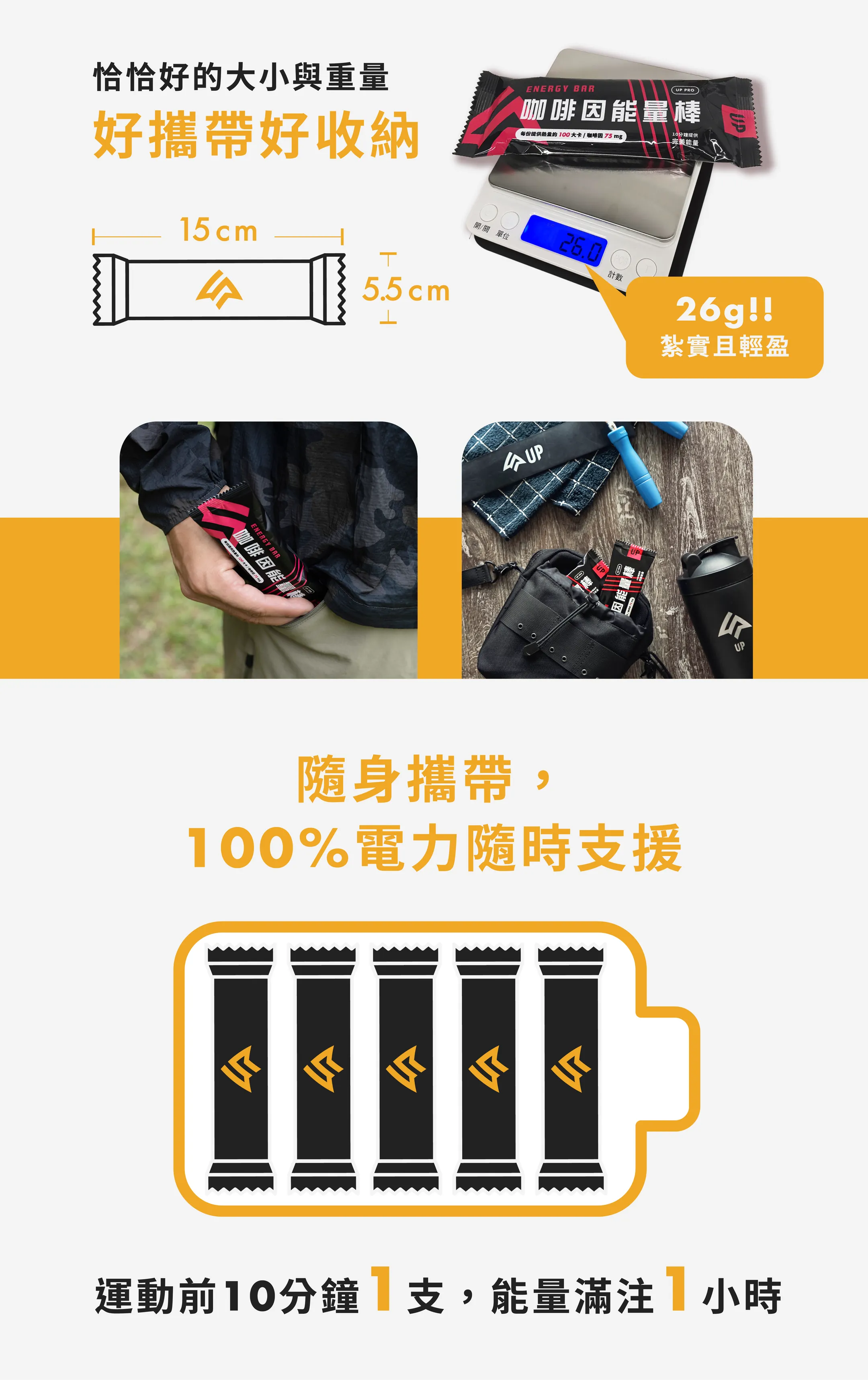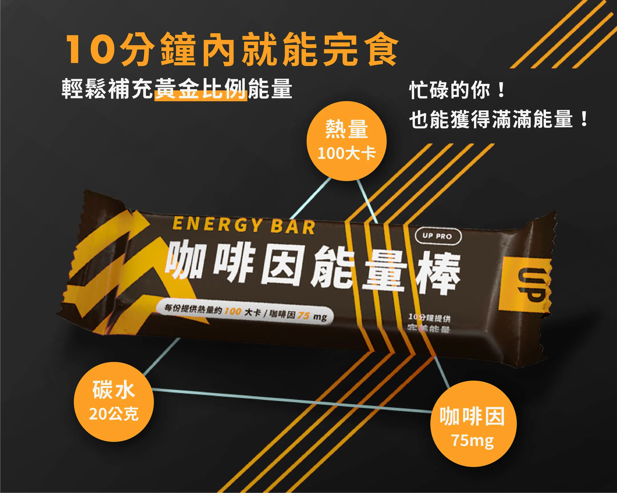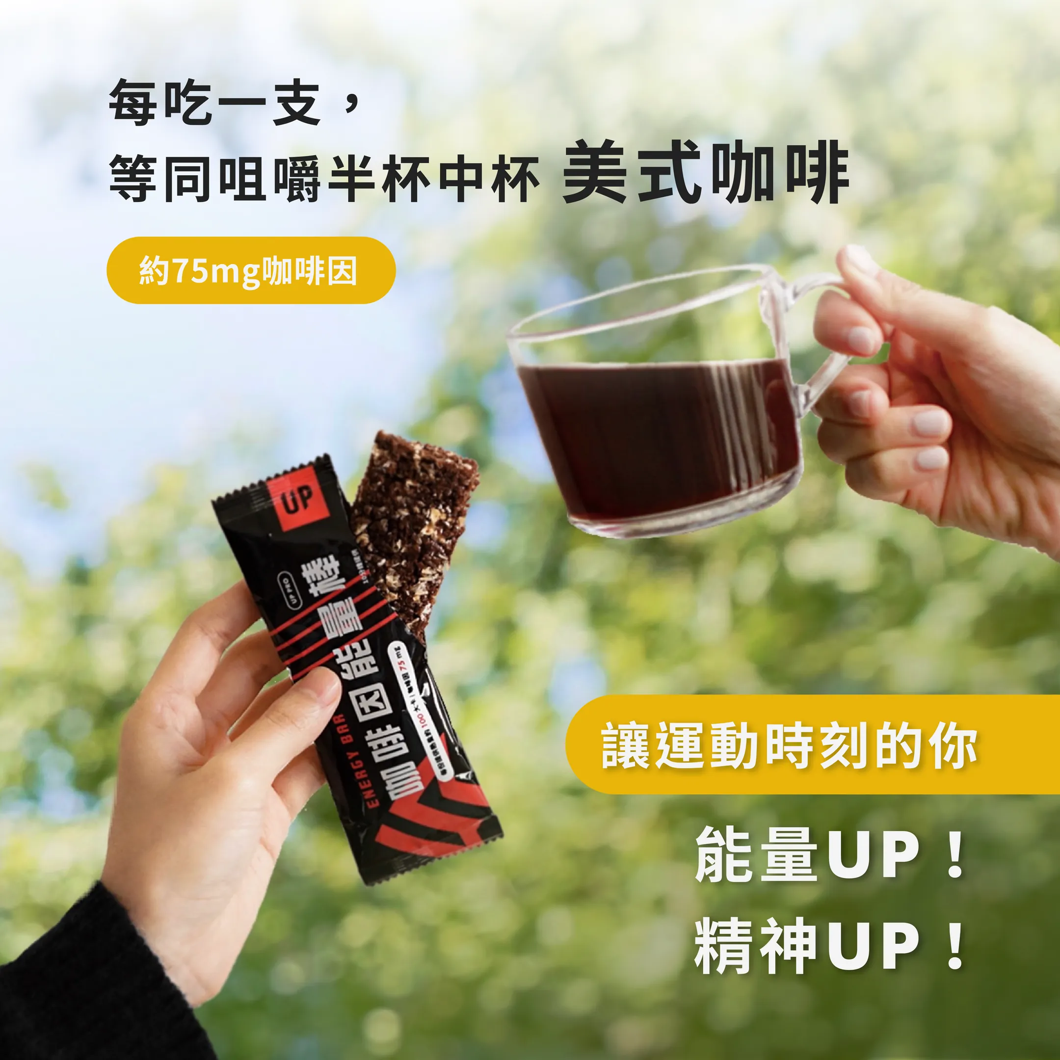 UP Sports 咖啡因能量棒(香蕉可可口味)結合碳水化合物與75mg瓜拿納咖啡因,提供運動前快速補給。嚴選糙米、大燕麥片、台灣香蕉乾與法國可可粉製成,低於100卡熱量,適合跑步、自行車、健身等運動。26g輕巧包裝,方便攜帶,助您隨時補充能量。