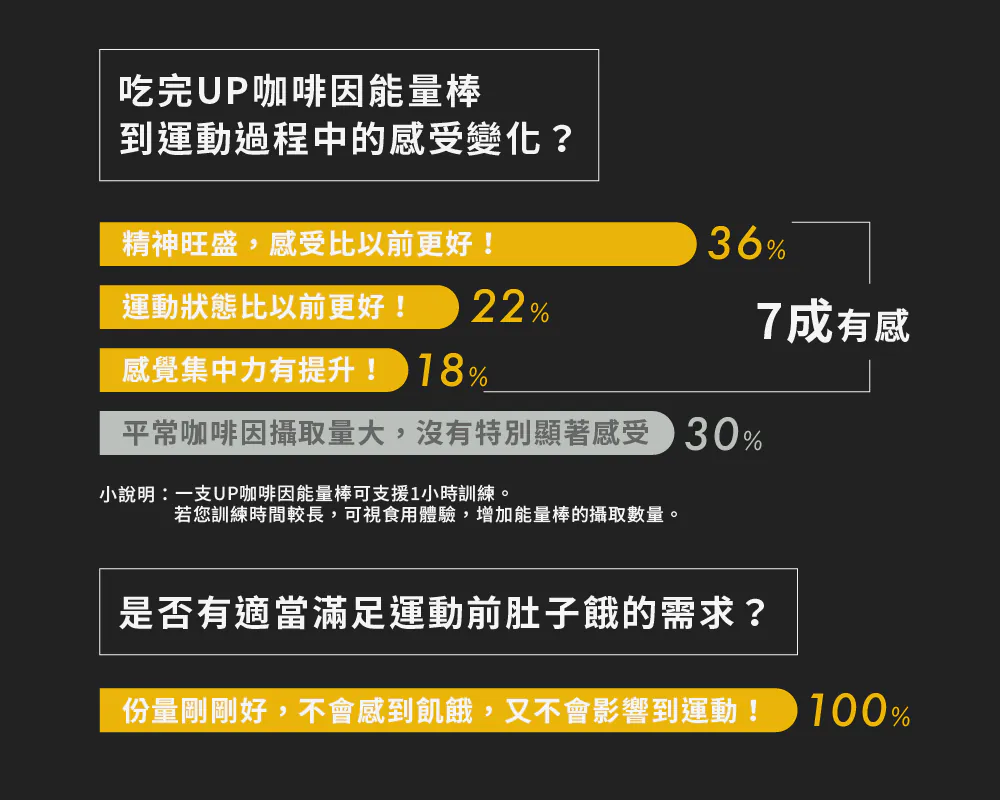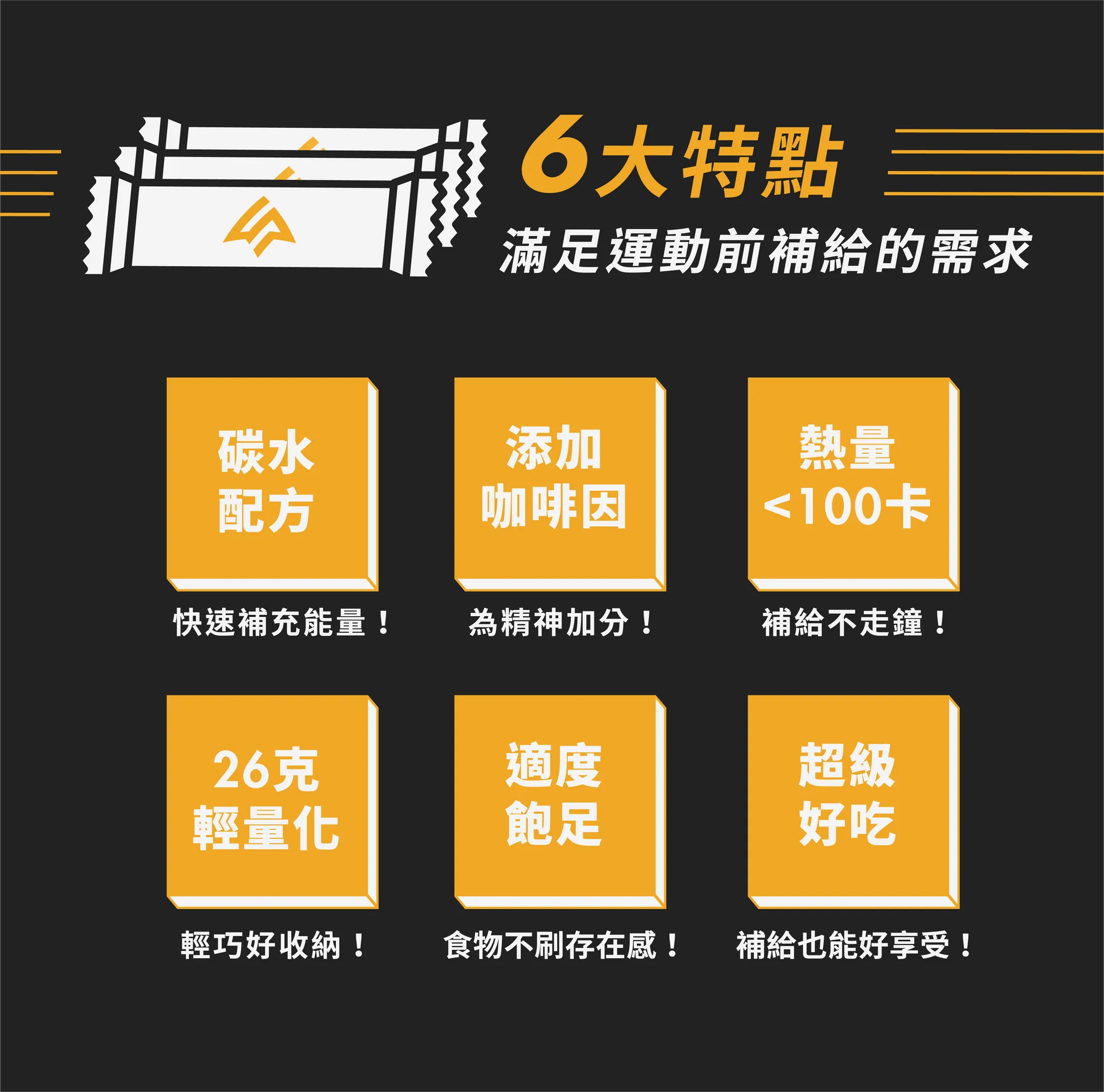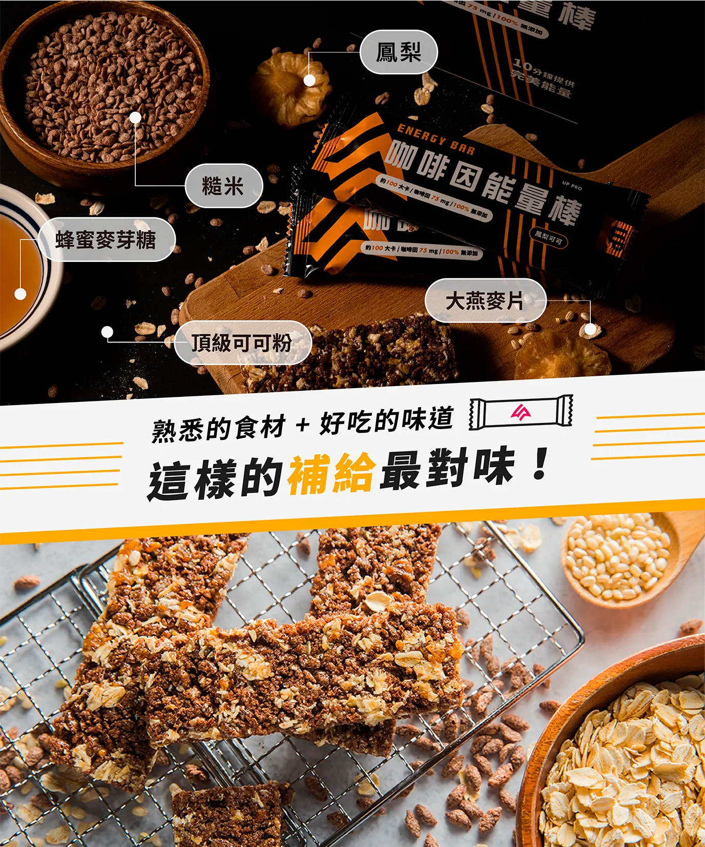UP Sports 咖啡因能量棒(香蕉可可口味)結合碳水化合物與75mg瓜拿納咖啡因,提供運動前快速補給。嚴選糙米、大燕麥片、台灣香蕉乾與法國可可粉製成,低於100卡熱量,適合跑步、自行車、健身等運動。26g輕巧包裝,方便攜帶,助您隨時補充能量。