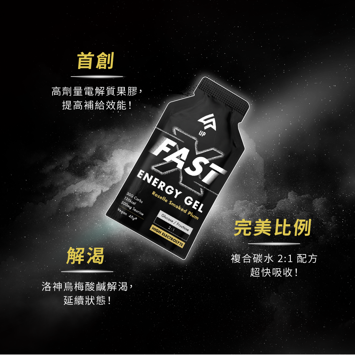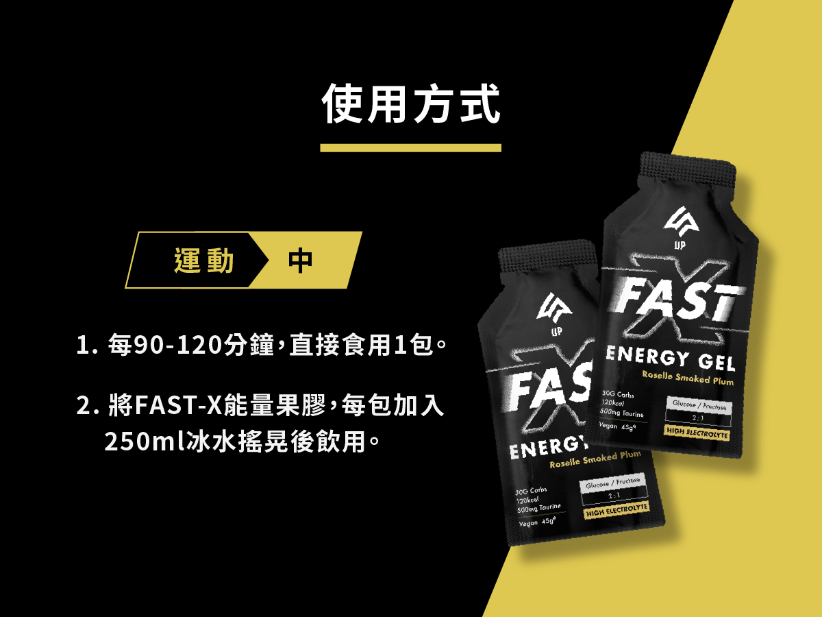 UP Sports FAST 能量果膠專為長跑、越野、自行車等耐力運動打造,補充碳水與牛磺酸,並含有高單位電解質400毫克鈉離子,幫助大量流汗時使用,維持表現、快速補充液態能量。口味洛神烏梅,酸鹹不膩,45g隨身包裝,運動補給超方便。