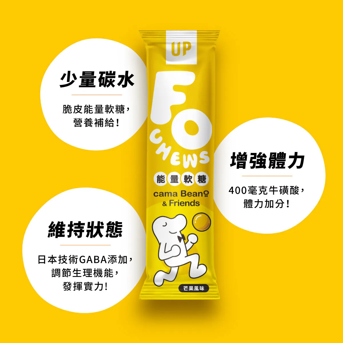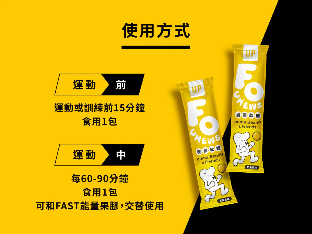 UP Sports-FOCHEWS能量軟糖,無論是在運動前後或日常生活中,都是為提升能量和集中力的最佳選擇。每盒包含10包,美味的芒果和多多風味,讓你在享受美味的同時,輕鬆補充所需的能量。這款能量軟糖含有高效能量成分,適合運動愛好者及繁忙的上班族,讓你隨時隨地保持最佳狀態。