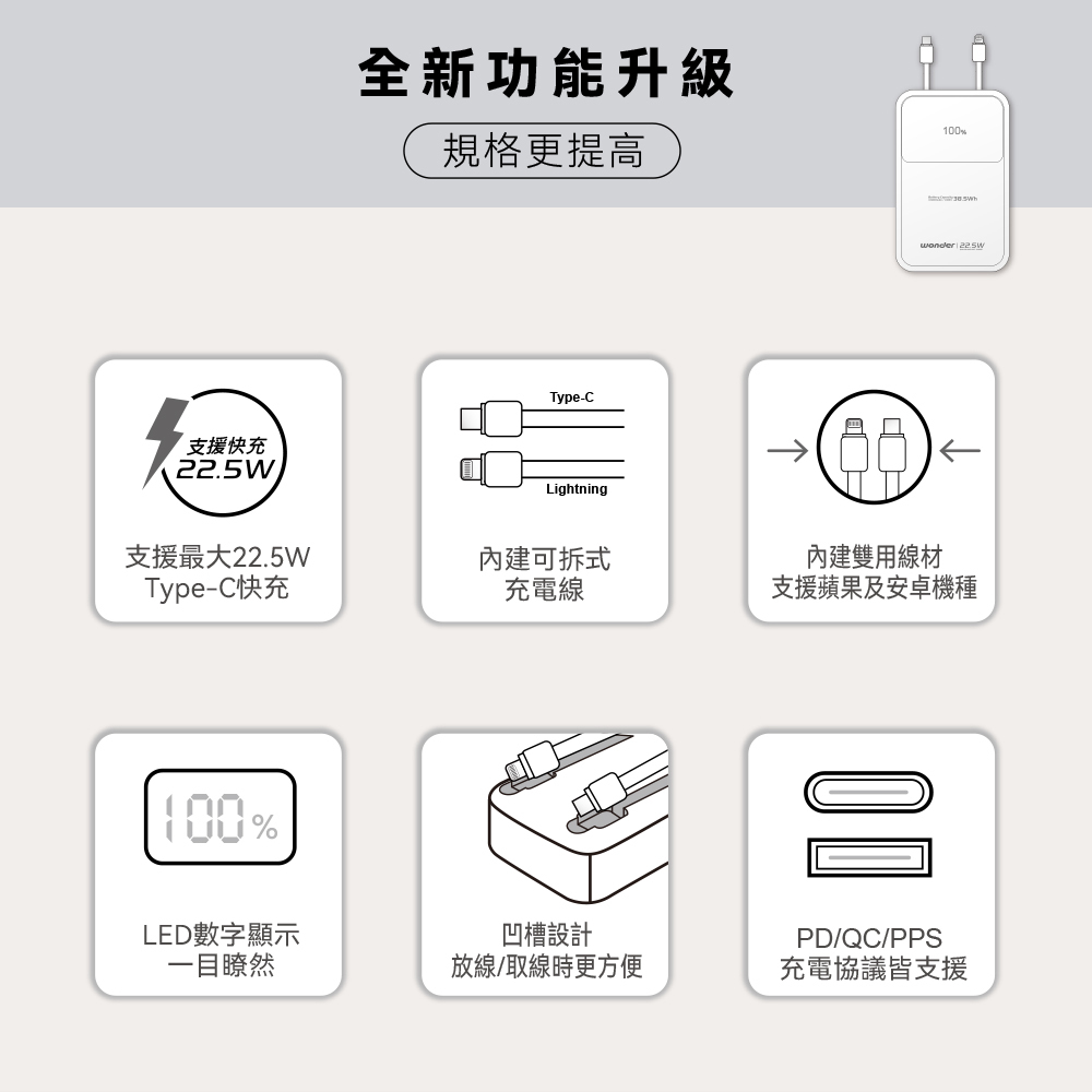 出差旅行必備!WONDER 旺德電通 可拆線式快充行動電源,提供 10,000mAh 與 20,000mAh 容量選擇,支援 PD / QC / PPS 快充協議,讓手機、平板隨時保持滿電。內建可拆式雙充電線,減少額外線材負擔,搭配 LED 電量顯示與 Wh 安檢標示,無論日常通勤或長途旅遊都安心可靠。