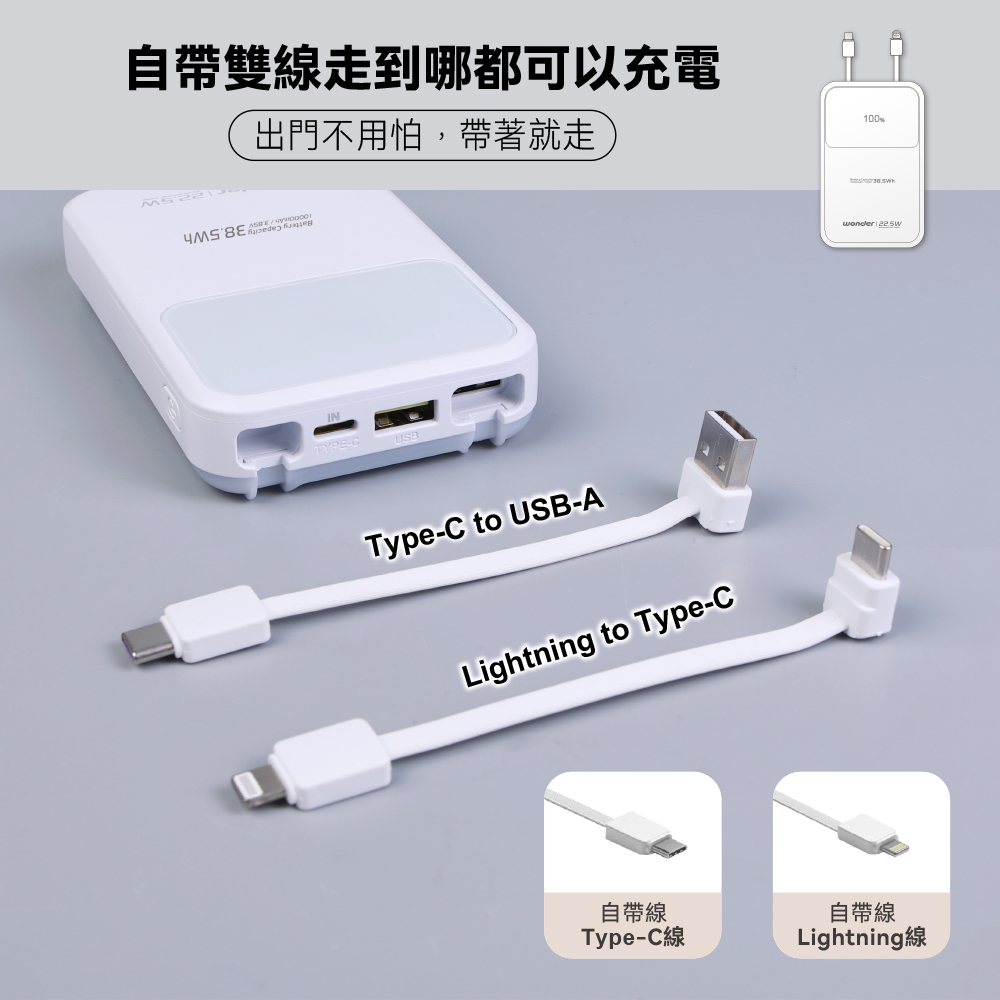 ✔ 內建 Type-C / Lightning 可拆式充電線