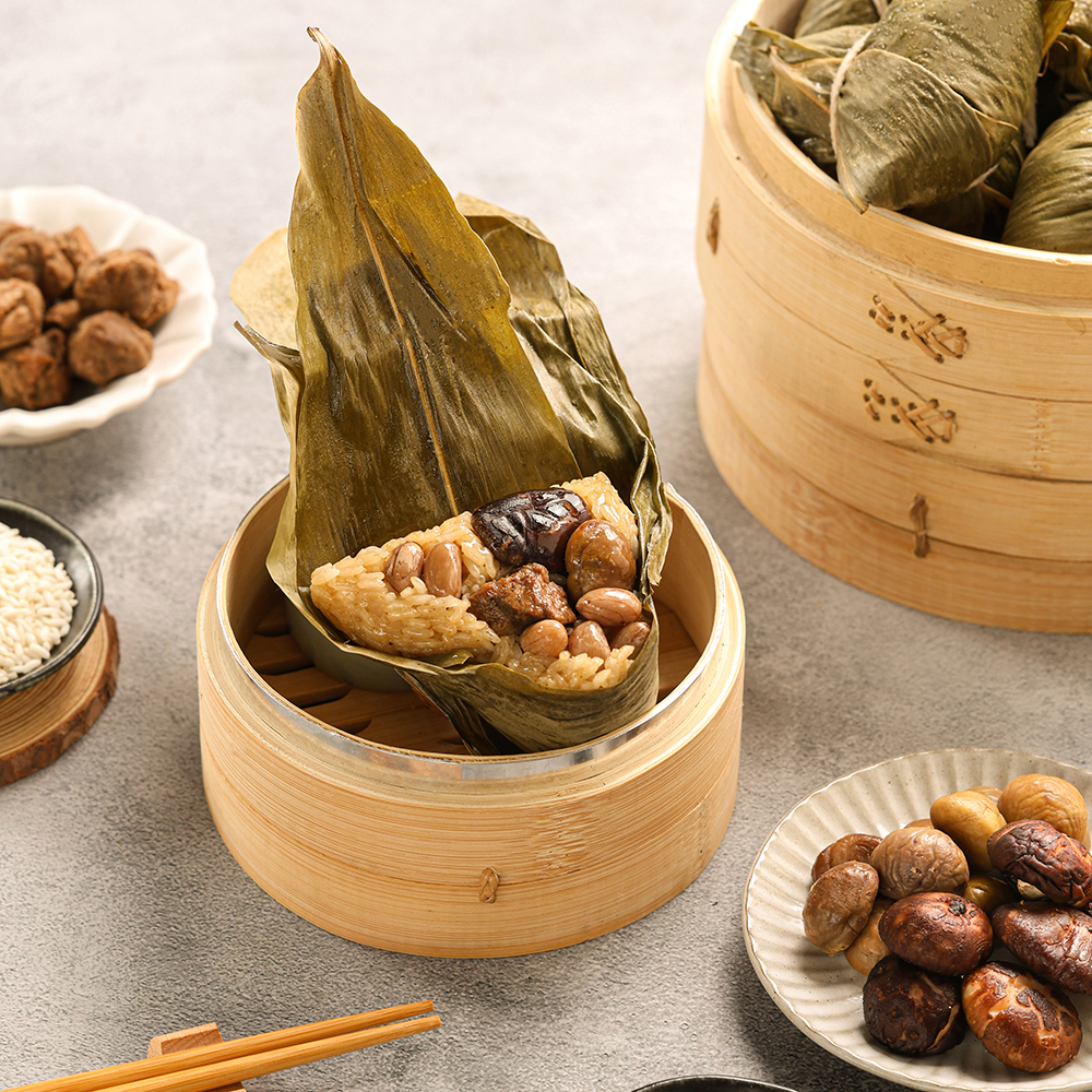 嚴選在地食材,北港綿密花生、埔里碩大香菇及鮮甜栗子入粽,Q彈糯米與鮮甜栗子及粽葉的清香完美融合。。