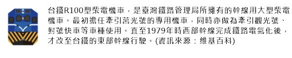 • 商品品項:R100型藍色柴電機火車車頭x1+冷氣平快車廂x1