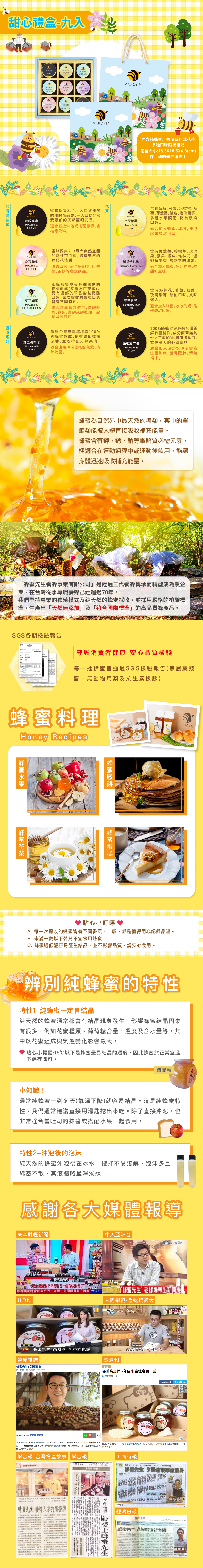 【商品敘述】內含9罐純蜂蜜、蜜漬系列或花茶,隨機搭配